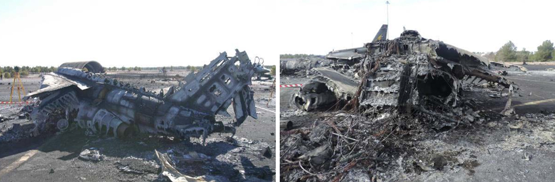 Με την απογείωσή του το F-16 με χειριστές τους Λάσκαρη και Ζάγκα πήρε έντονη δεξιά κλίση και συνετρίβη κοντά στο υπόστεγο D-4 της αεροπορικής βάσης Λος Γιάνος. Aπό τη βίαιη πρόσκρουση και τις εκρήξεις που ακολούθησαν καταστράφηκαν ολοσχερώς ένα γαλλικό Mirage 2000D, ένα γαλλικό Alpha Jet και ένα ιταλικό AMX. Ελαφρές ζημιές καταγράφηκαν σε ένα γαλλικό Rafale, ένα ακόμη ιταλικό AMX και ένα F-15E της αμερικανικής αεροπορίας.
