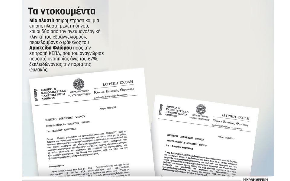 Ο Φλώρος αποφυλακίστηκε στα μέσα Αυγούστου, έχοντας διαγνωστεί από επιτροπή ΚΕΠΑ (Κέντρο Πιστοποίησης Αναπηρίας) με ποσοστό αναπηρίας μεγαλύτερο από 67%. Ανάμεσα στις ιατρικές γνωματεύσεις που υπήρχαν στον φάκελό του ήταν μία πλαστή σπιρομέτρηση και μία επίσης πλαστή μελέτη ύπνου (και οι δύο από την πνευμονολογική κλινική του «Ευαγγελισμού») σύμφωνα με τις οποίες ο κρατούμενος αντιμετώπιζε σοβαρό πρόβλημα υπνικής άπνοιας. Σε μηνυτήρια αναφορά του, που βρίσκεται στον φάκελο της υπόθεσης, ο διευθυντής της κλινικής κ. Ζακυνθινός περιγράφει ότι μαζί με συνεργάτες του ανέτρεξαν στα βίντεο από την εξέταση του Αριστείδη Φλώρου και διαπίστωσαν ότι τη νύχτα της 19ης προς 20 Οκτωβρίου 2017 υπήρχαν όχι μία αλλά δύο καταγραφές με στοιχεία ασθενή «Αριστείδης Φλώρος». «Στη μία απεικονίζεται πράγματι ο Αριστείδης Φλώρος, στην άλλη δε, η οποία επίσης έχει καταχωριστεί υπό στοιχεία “Αριστείδης Φλώρος” απεικονίζεται άλλος ασθενής, που την ίδια ημέρα υποβαλλόταν επίσης σε μελέτη ύπνου σε διαφορετικό θάλαμο (σ.σ. έπασχε από βαριά υπνική άπνοια)». Από το βίντεο προέκυψε ότι ο γιατρός που, τη νύχτα της εξέτασης, συνόδευε τον Αριστείδη Φλώρο ήταν ο ωτορινολαρυγγολόγος (ΩΡΛ) Γ. Κ.