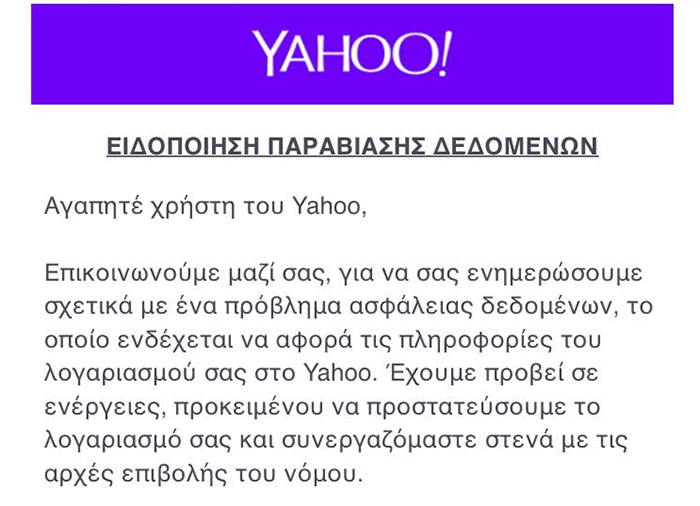 Στις 17 Δεκεμβρίου 2016, όταν έγινε αντιληπτή η έκταση της ζημιάς, η Yahoo ειδοποίησε και τους Ελληνες χρήστες των υπηρεσιών της για την πιθανή παραβίαση των δεδομένων τους. Σε σχετικό email ο υπεύθυνος ασφαλείας της αμερικανικής εταιρείας συνιστούσε στους χρήστες να αλλάξουν κωδικούς πρόσβασης και να ελέγξουν όλους τους λογαριασμούς τους για ύποπτη δραστηριότητα.
