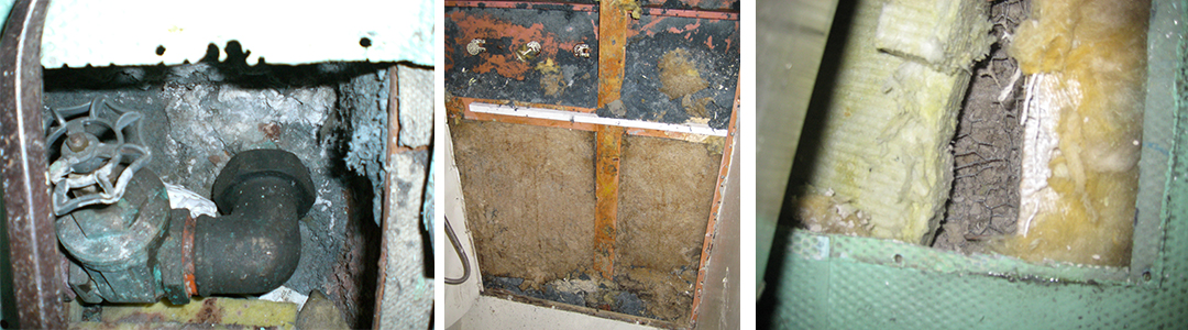 Ο ίδιος μάρτυρας είχε συμπληρώσει ότι οι μονώσεις λόγω παλαιότητας τρίβονταν από μόνες τους και ότι από τις υψηλές θερμοκρασίες των σωληνώσεων και τις έντονες δονήσεις των πλοίων ο αμίαντος μετατρεπόταν σε σκόνη. Ιδιαίτερα φθαρμένες, σύμφωνα με τον ίδιο μάρτυρα, ήταν οι μονώσεις αμιάντου μέσα και γύρω από τους λέβητες, σε πολλά σημεία των μηχανών, στις τσιμούχες και στις αντλίες. «Ήταν σα να γκρεμίζουν το διαμέρισμά σου και να μένεις μέσα», είχε πει στην «Κ» το 2016 άλλος απόστρατος, ο οποίος επίσης νόσησε με καρκίνο και συμμετείχε στην παραλαβή του «Κουντουριώτη».