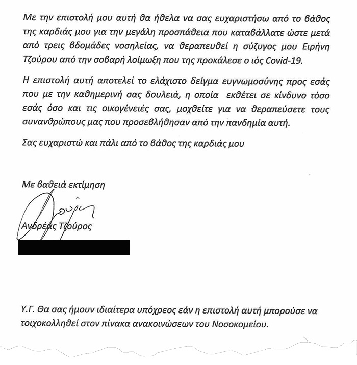 Σε τεστ που έκανε κατά τη 10η ημέρα νοσηλείας η κ. Τζούρου βγήκε αρνητική στον νέο κορωνοϊό και μεταφέρθηκε σε τετράκλινο θάλαμο της Πνευμονολογικής. Εκεί ολοκλήρωσε τη θεραπεία της. Ο σύζυγός της έστειλε πρόσφατα ευχαριστήρια επιστολή στο προσωπικό του νοσοκομείου «Αττικόν». Ζήτησε να την κολλήσουν στον πίνακα ανακοινώσεων, για τη διαβάζουν όλοι. «Αποτελεί το ελάχιστο δείγμα ευγνωμοσύνης προς εσάς, που με την καθημερινή σας δουλειά, η οποία εκθέτει σε κίνδυνο τόσο εσάς όσο και τις οικογένειές σας, μοχθείτε για να θεραπεύσετε τους συνανθρώπους μας που προσεβλήθησαν από την πανδημία», έγραψε.