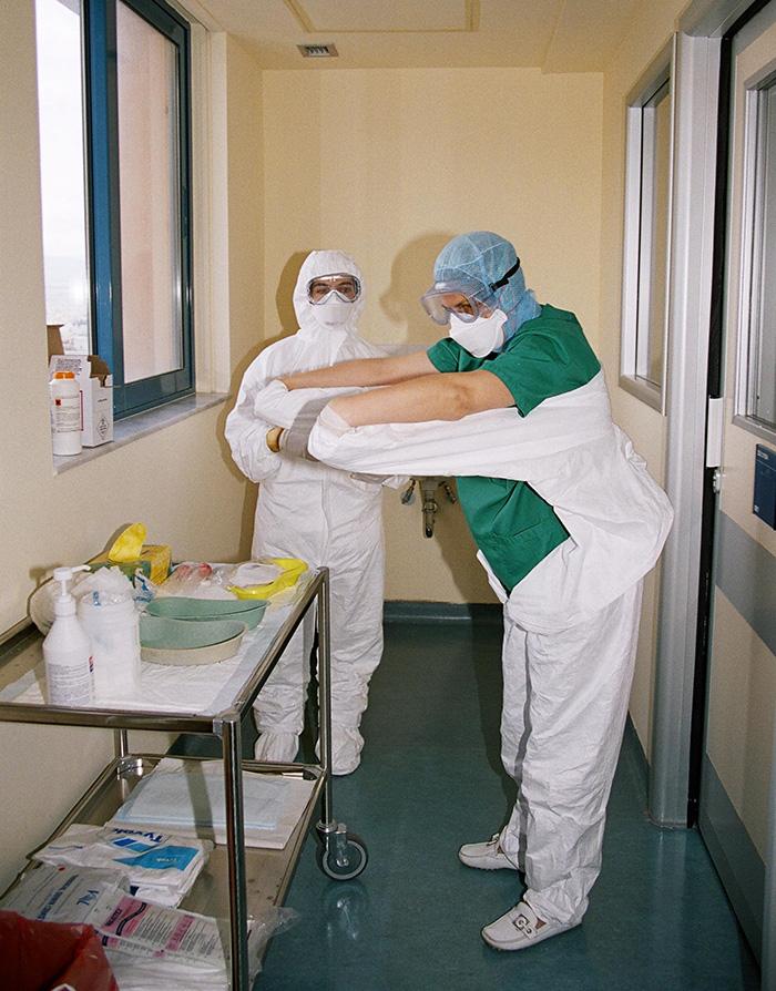 Οι γιατροί και οι νοσηλευτές που την επισκέπτονταν στη μονάδα λοιμώξεων στο νοσοκομείο «Αττικόν» φορούσαν ολόσωμες στολές και διπλά ζευγάρια γάντια. Δεν μπορούσε να διακρίνει πρόσωπα, ή ρόλους, παρά μόνο τα μάτια τους – κι αυτά όχι πάντα. Υπήρχαν στιγμές που θόλωναν οι φακοί στα χοντρά προστατευτικά γυαλιά τους.