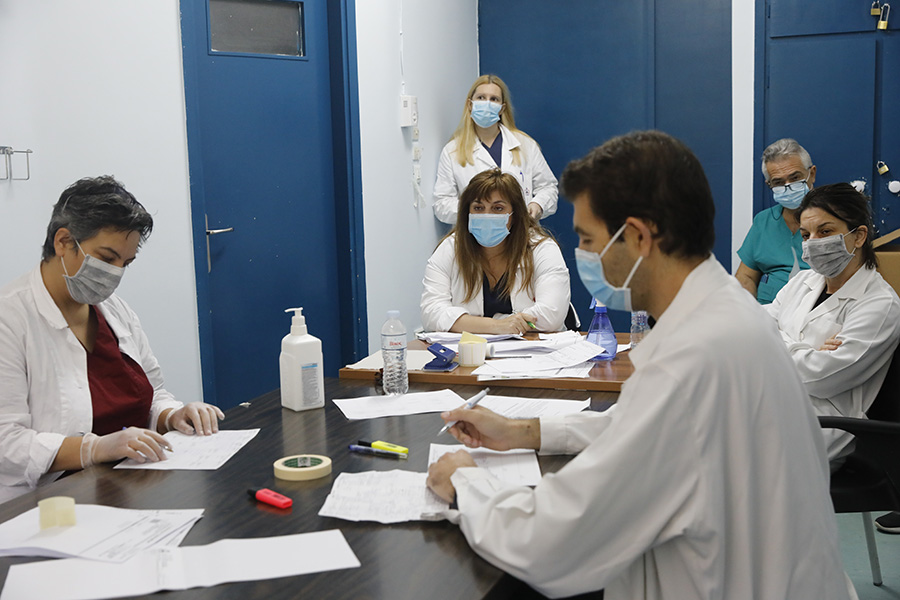 Στην «πράσινη ζώνη», σε έναν πρώην θάλαμο ασθενών που μετατράπηκε σε γραφείο γιατρών για να χωράει αρκετά άτομα τηρώντας αποστάσεις ασφαλείας, πραγματοποιείται μετά τις 8.30 η πρωινή σύσκεψη. Την αποκαλούν «καθιστή επίσκεψη». Συζητούν μέσα σε μία ώρα για ό,τι συνέβη τη νύχτα, για τις ζωτικές ενδείξεις των νοσηλευόμενων, τις εξετάσεις που τους έκαναν και σημειώνουν σε έναν πίνακα τις εκκρεμότητες.