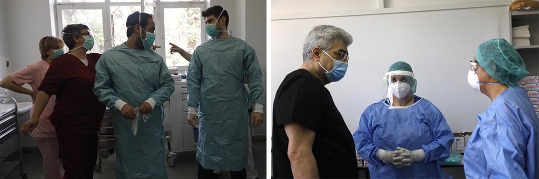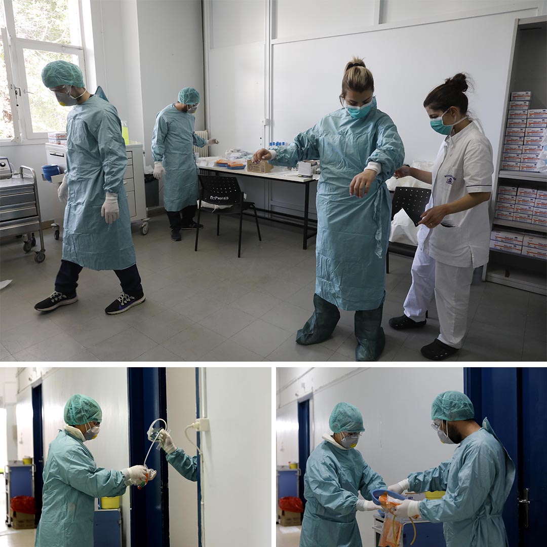 Την εκπαίδευση του προσωπικού στη χρήση του προστατευτικού εξοπλισμού ανέλαβε εθελοντικά η Κατερίνα Ηλιοπούλου, απόστρατη αξιωματικός με εμπειρία εργασίας σε μονάδες εντατικής θεραπείας. Τους έδειχνε ανά ομάδες των τριών (από γιατρούς και νοσηλευτές μέχρι τις καθαρίστριες τις κλινικής) ξανά και ξανά τα βήματα που πρέπει να κάνουν για να ελαχιστοποιήσουν την πιθανότητα σφάλματος. Μπορεί να δαπανήσουν έως και δέκα λεπτά στο ντύσιμο. Αντίστοιχος χρόνος απαιτείται και για να βγάλουν την «πανοπλία» τους.