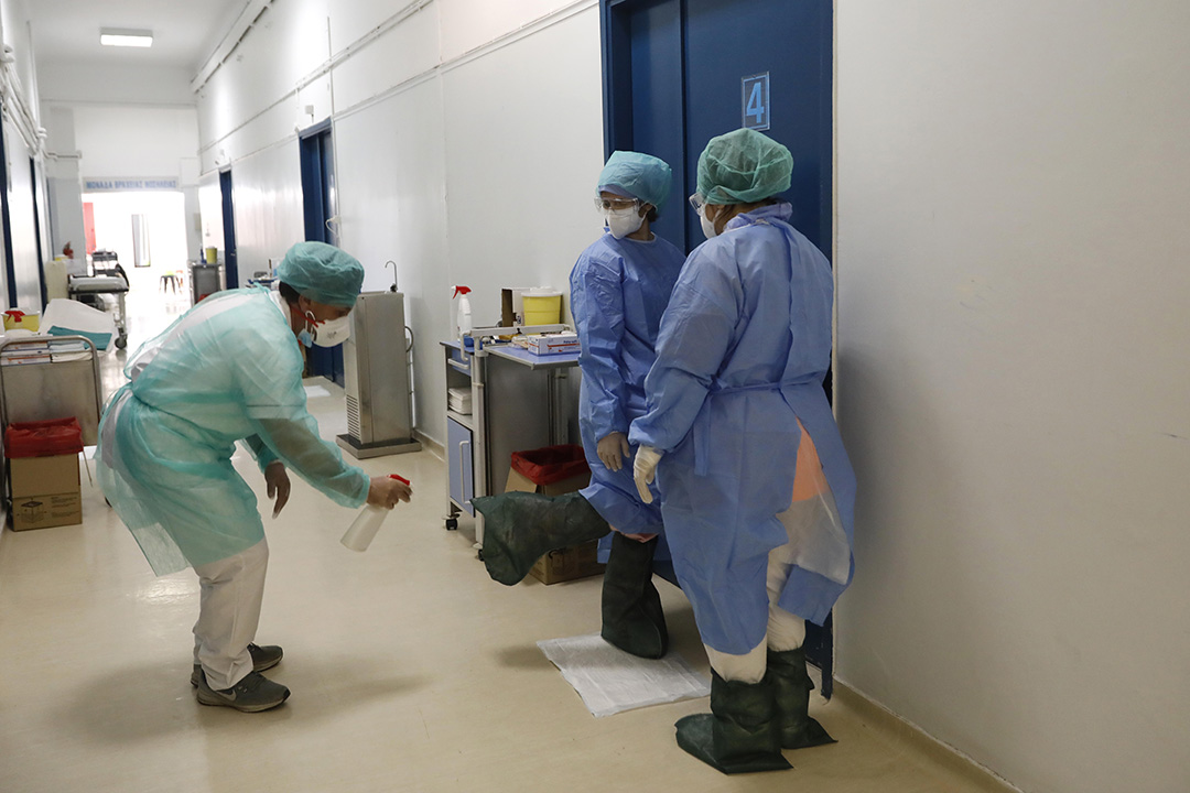 Ένας συνάδελφός του –ο πρώτος βοηθός– στέκεται έξω από τον θάλαμο για να συσκευάσει φιαλίδια αιμοληψίας. Πίσω από μια γκρίζα πόρτα, στην αποστειρωμένη «πράσινη ζώνη», ένας ακόμη γιατρός –ο δεύτερος βοηθός– περιμένει για να συνδράμει ανά πάσα στιγμή. Η νοσηλεία στην πρώτη γραμμή μάχης κατά της πανδημίας είναι ομαδική δουλειά.