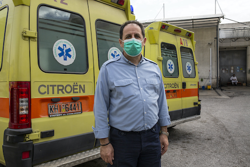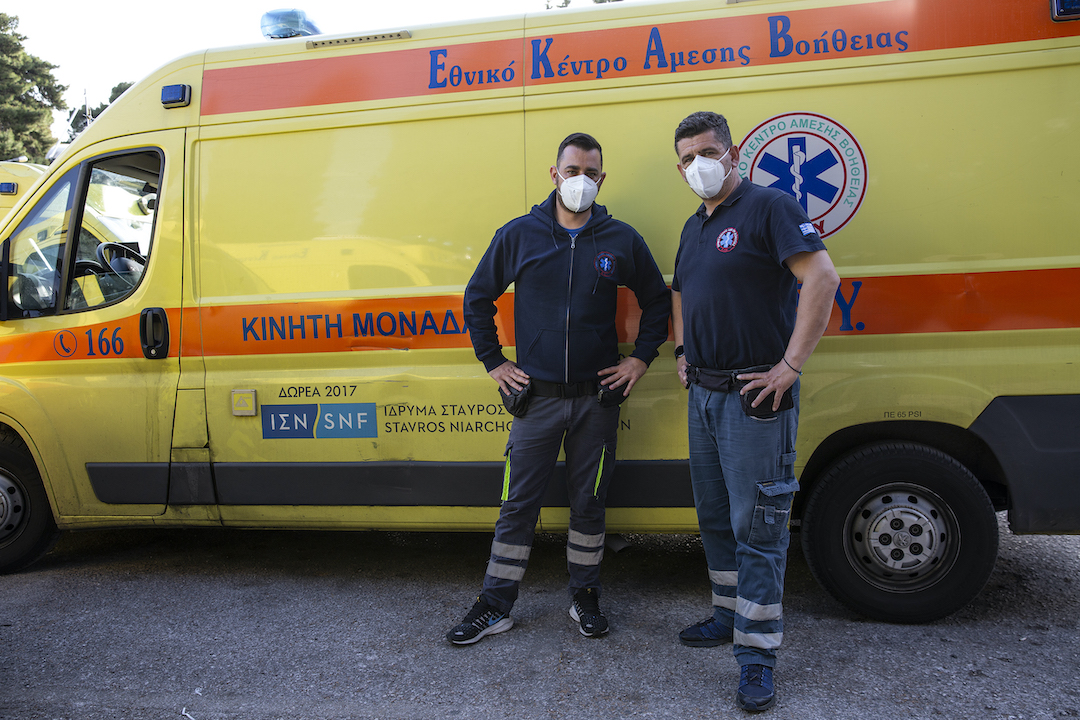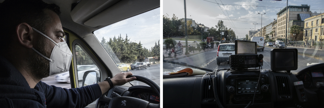 «Όταν ξεκίνησε η πανδημία, στο πρώτο κύμα, σκεφτήκαμε ότι θα περάσει, αλλά μέρα με τη μέρα γιγαντώθηκε και έχουμε φτάσει σε ένα πολύ δύσκολο σημείο», λέει ο Παύλος Ζιώγας. «Μεγάλος φόρτος εργασίας, ο τελευταίος χρόνος είναι βουνό». Μόλις έχει ολοκληρώσει τη μεταφορά διασωληνωμένου ασθενούς από νοσοκομείο σε νοσοκομείο και περιμένει στην Κεντρική Υπηρεσία του ΕΚΑΒ να καθαριστεί το όχημά του για να κληθεί από το κέντρο επιχειρήσεων σε νέα αποστολή. «“Σήμα, τέλος” λέμε μεταξύ μας. Δεν υπάρχει χρόνος ξεκούρασης», λέει.