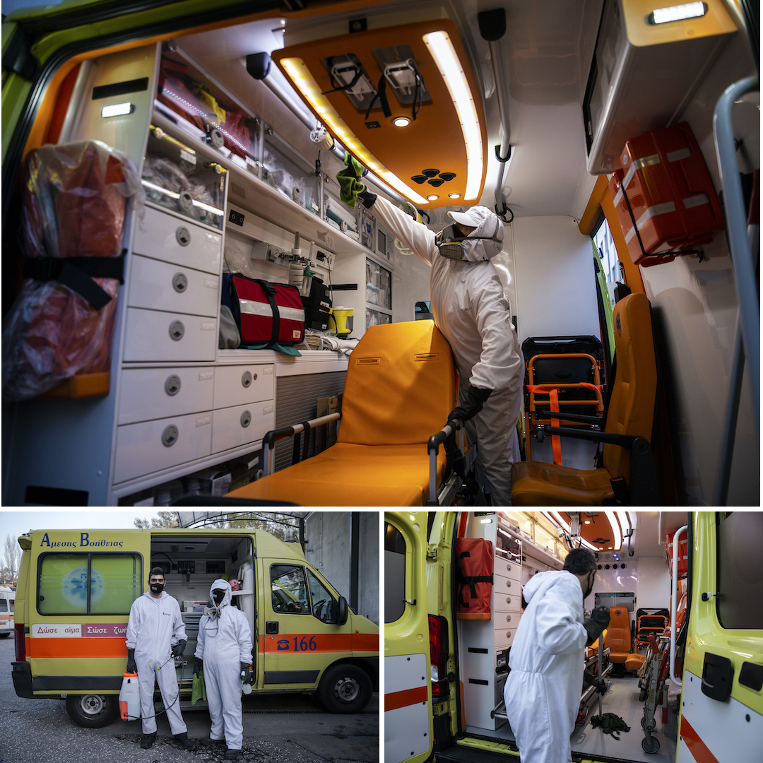 Τρία σημεία απολύμανσης λειτουργούν στην Αττική και ένα από αυτά βρίσκεται στα κεντρικά του ΕΚΑΒ, πίσω από το νοσοκομείο «Γεώργιος Γεννηματάς». Οι καθαριστές σημειώνουν την ώρα άφιξης κάθε οχήματος, τον αριθμό της πινακίδας, ψεκάζουν και τρίβουν ξανά και ξανά σε βάρδιες, όλο το 24ωρο, επτά ημέρες την εβδομάδα.
