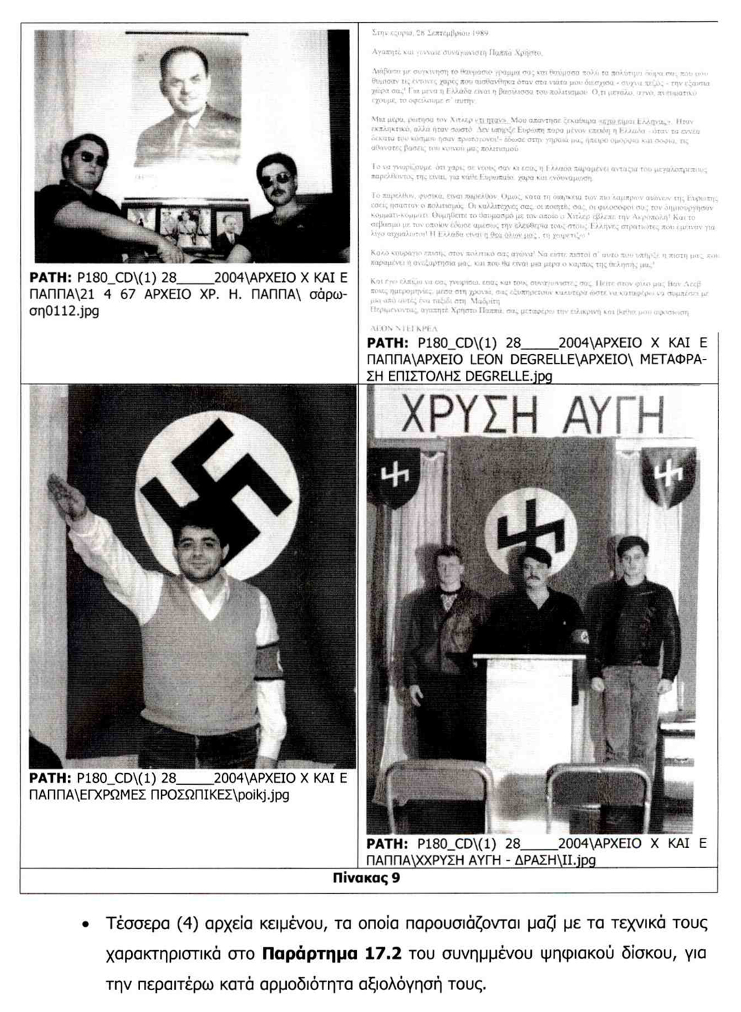 Την ίδια στιγμή, η Ασφάλεια κάνει φύλλο και φτερό το υλικό που έχει κατασχεθεί: κινητά τηλέφωνα, σκληροί δίσκοι και υπολογιστές. Πρόκειται για πολύτιμο υλικό που σε πολλές περιπτώσεις αντικρούει τα όσα είχαν ισχυριστεί στις αρχικές τους καταθέσεις οι κατηγορούμενοι, όπως π.χ. οι χειρόγραφες σημειώσεις του Χρήστου Παππά στο κρυφό καταστατικό, την ύπαρξη του οποίου δήλωνε αρχικά πως αγνοούσε, χαρακτηρίζοντάς το κείμενο «βλακώδες», ή τα βίντεο και οι φωτογραφίες που αποκαλύπτουν τη ναζιστική εμμονή που τόσο έντονα όλοι οι κατηγορούμενοι απαρνούνταν.