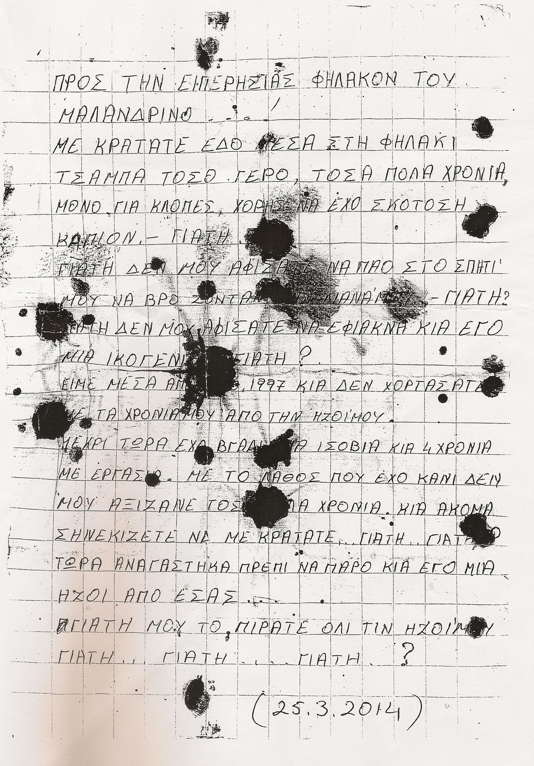 Φαίνεται πως τον τελευταίο ενάμιση μήνα, του είχε γίνει «εμμονή» η αποφυλάκιση. Αυτό τουλάχιστον έδειξε το χειρόγραφο σημείωμα που έδωσε ο ίδιος στον άτυχο Γιώργο Τσιρώνη, όταν εκείνος μπήκε μετά τις 12 το μεσημέρι, ανήμερα την 25η Μαρτίου, στο κελί. «Συνεχίζετε να με κρατάτε. Γιατί… γιατί; Τώρα αναγκαστικά πρέπει να πάρω κι εγώ μια ζωή από εσάς».