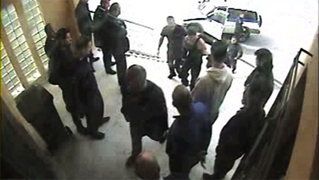 Το κλίμα –σύμφωνα πάντα με την κατάθεση του αξιωματικού Εσωτερικών Υποθέσεων– είναι φορτισμένο, «υπήρχε ιδιαίτερος εκνευρισμός λόγω του γεγονότος ότι σκότωσε τον συνάδελφό τους... πολλοί έφτυναν, έβριζαν και αποδοκίμαζαν τον κρατούμενο». Οι δύο αστυνομικοί υπεύθυνοι της μεταγωγής φαίνονται να στέκονται έξω από το κτίριο, ρίχνουν μερικές κλεφτές ματιές στο εσωτερικό της φυλακής από το τζάμι της εισόδου και λίγα λεπτά αργότερα επιβιβάζονται στο τζιπ και φεύγουν.