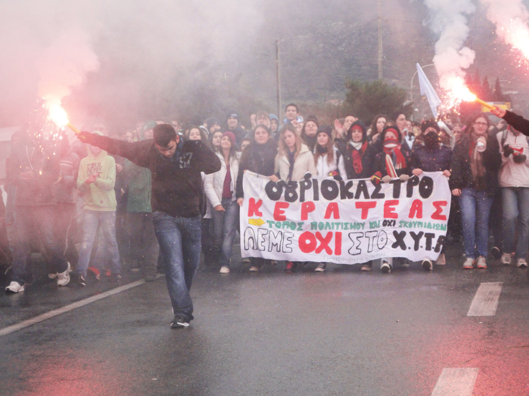 «Ακούγονταν τα μπαμ και οι μισοί έφευγαν από την τάξη και κατέβαιναν κάτω. Είχαμε θέμα απουσιών και ζητήσαμε επιείκεια από τους δασκάλους», λέει. Δύο φορές οι μαθητές του λυκείου συνοδευόμενοι από γονείς και καθηγητές κατέβηκαν για να διαδηλώσουν ειρηνικά, ενώ είχε προηγηθεί συνεννόηση με την Αστυνομία για να μη συμβούν επεισόδια. «Τα παιδιά έδωσαν τον τόνο στα μέσα ενημέρωσης», λέει ο κ. Ιατρού. «Αυτά έβγαιναν μπροστά και μίλαγαν. Γιατί όταν ακούς ένα νέο παιδί είναι διαφορετικό».