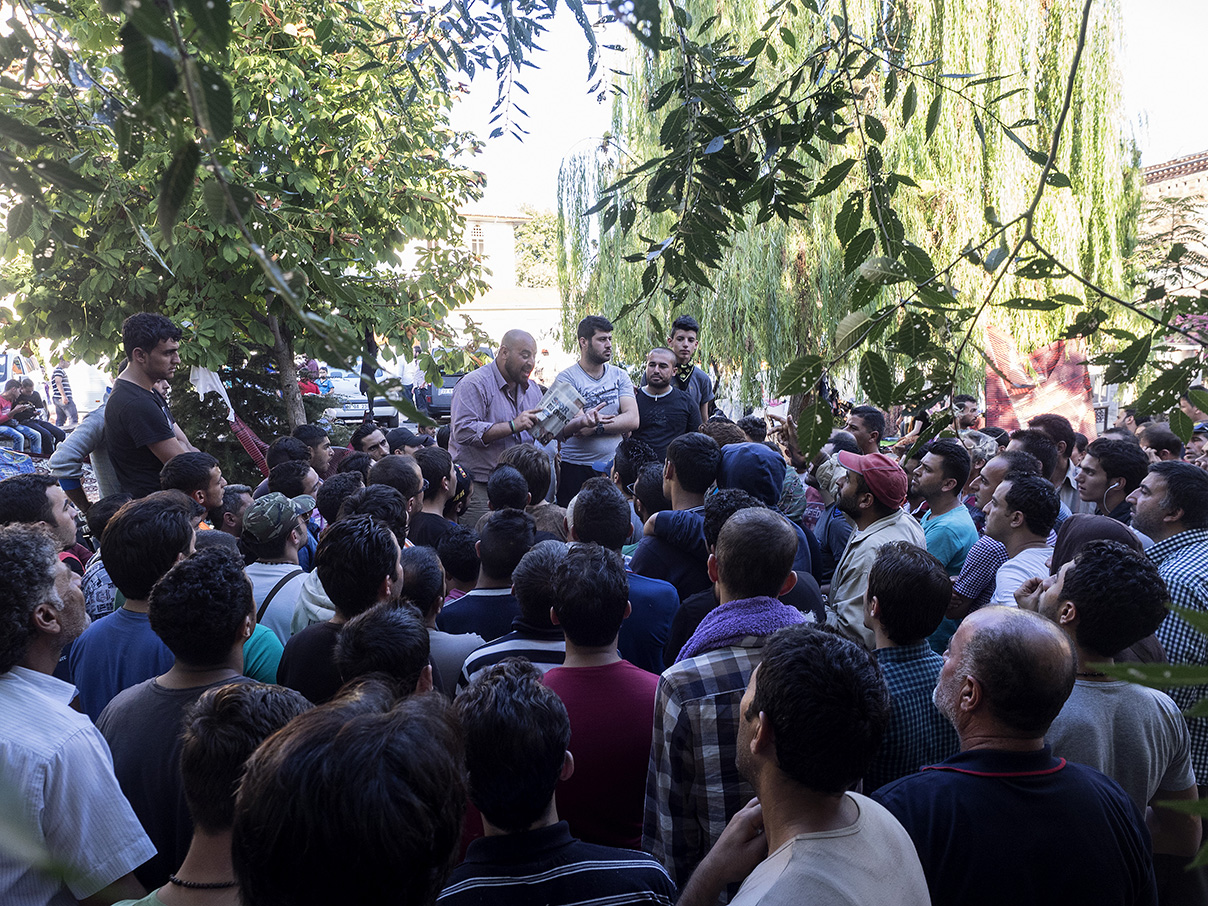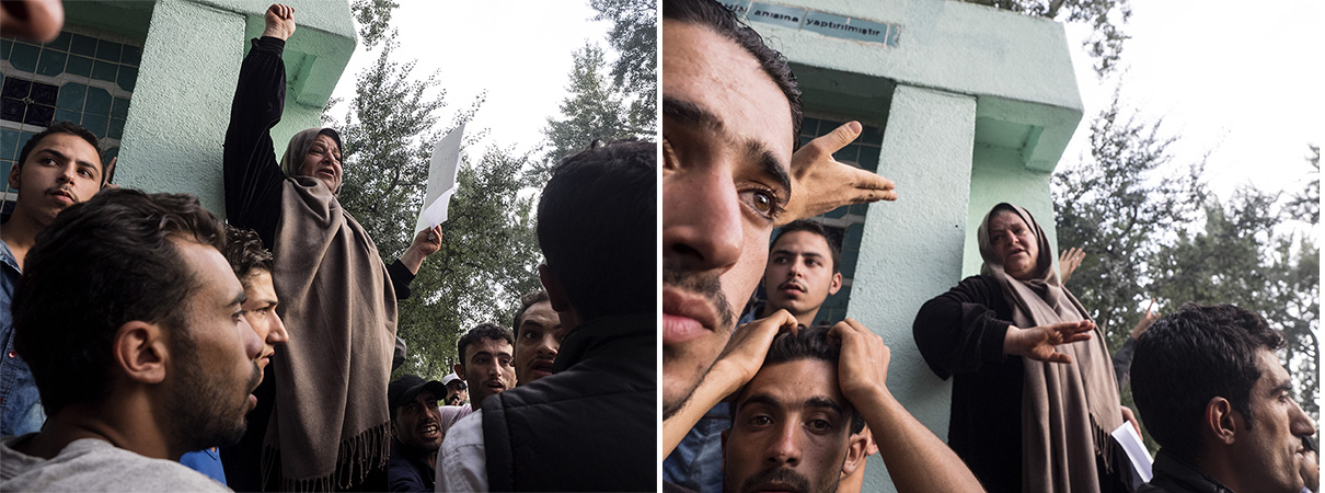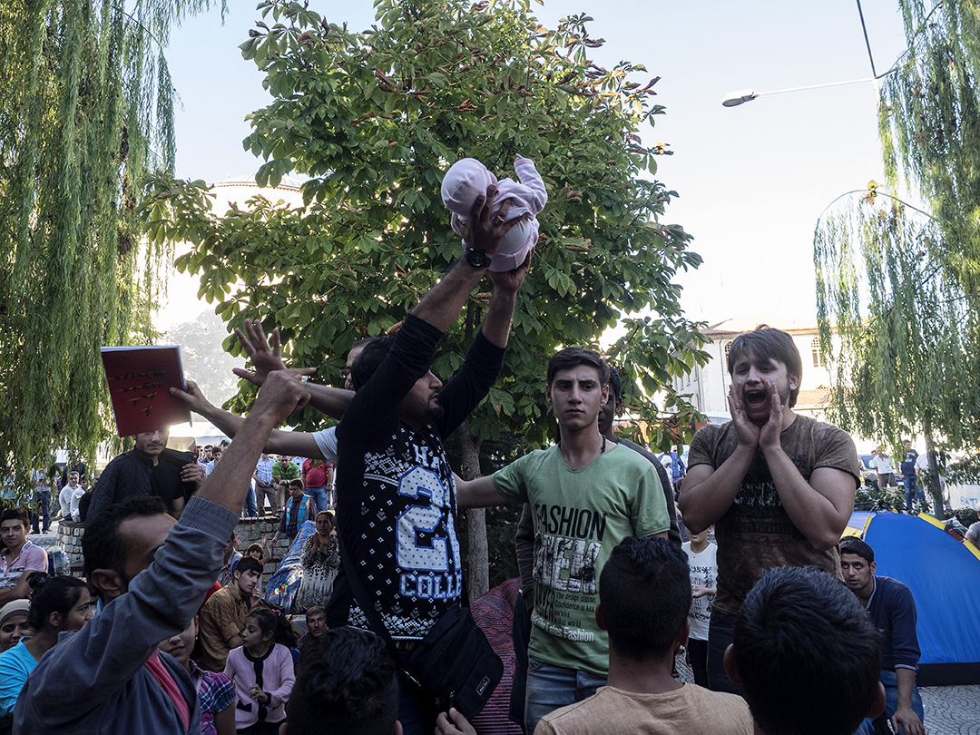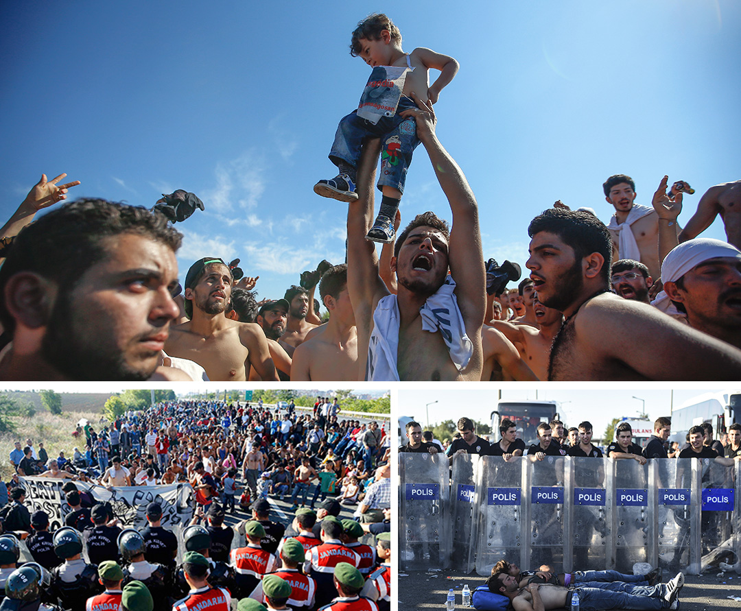 Εκατοντάδες πρόσφυγες και μετανάστες διαδήλωναν στο πάρκο Ιλχάν Κομάν υπό διαρκή αστυνομική επιτήρηση. Υψωναν στον ουρανό τα βρέφη τους κραυγάζοντας ρυθμικά «Γερμανία, Γερμανία» και «Ελλάδα, Ελλάδα». Ενας εξ’ αυτών πρότασσε στις τηλεοπτικές κάμερες χαρτόνι με το σύνθημα: «Αγαπάμε τη Μέρκελ».