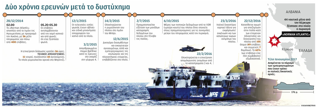 Σε λίγες ημέρες συμπληρώνονται δύο χρόνια από εκείνη τη μοιραία νύχτα. Έπειτα από αρκετή καθυστέρηση, το τελικό πόρισμα των εμπειρογνωμόνων που έχουν οριστεί από την ιταλική δικαιοσύνη αναμένεται στα τέλη Ιανουαρίου. Στο μεταξύ, μεγάλος αριθμός των επιβατών (περίπου το 65% όσων ταξίδευαν με το πλοίο) έχει έρθει σε εξωδικαστικό συμβιβασμό με τις εταιρείες που διαχειρίζονταν το πλοίο.