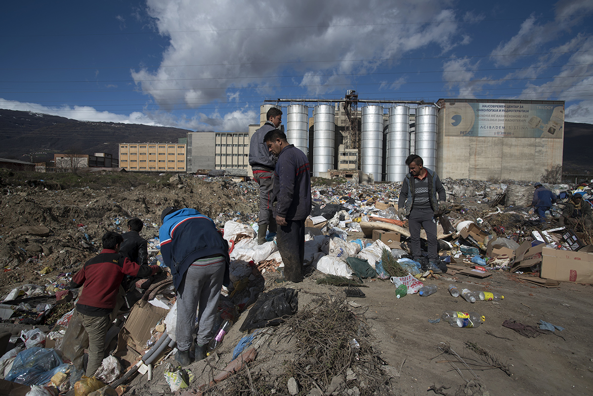 Είναι Ρομά, περίπου είκοσι άτομα, ανάμεσά τους ανήλικα αγόρια, με λιγδιασμένα ρούχα και σηκωμένα μανίκια. Ούτε αυτοί δυσφορούν με την παρουσία μας. Μαθαίνουμε ότι έρχονται κάθε μέρα στη χωματερή· μάλιστα τρεις οικογένειες ζουν στις παρυφές της. Πουλάνε σε μάντρες ανακυκλώσιμων τα 10 κιλά πλαστικού προς 1 ευρώ. Κάθε τόσο βάζουν φωτιά στους λόφους των σκουπιδιών, για να ξεχωρίσουν το μέταλλο.