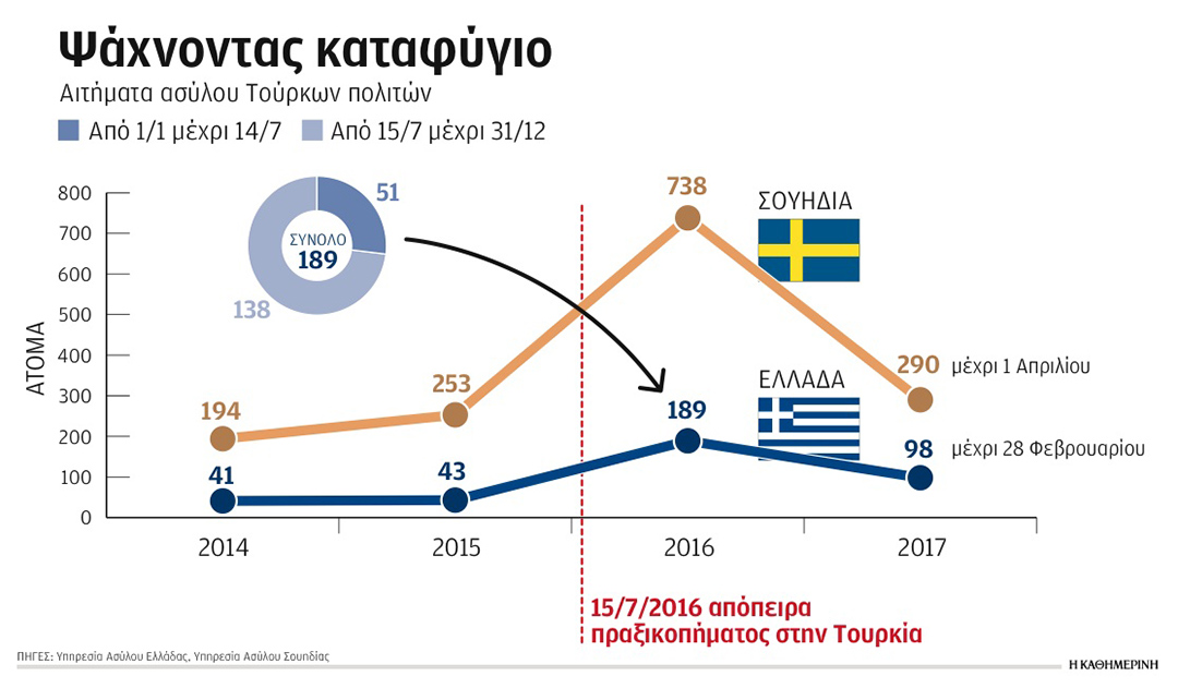Από εκείνη την ημέρα μέχρι και το τέλος Φεβρουαρίου, 236 Τούρκοι πολίτες έχουν ζητήσει διεθνή προστασία στην Ελλάδα, σύμφωνα με επίσημα στοιχεία της Υπηρεσίας Ασύλου. Η αύξηση είναι μεγάλη αν αναλογιστεί κανείς ότι το 2015 τα αντίστοιχα αιτήματα δεν ξεπερνούσαν τα 43. Παρόμοια τάση καταγράφεται και σε άλλα ευρωπαϊκά κράτη. Βάσει στοιχείων που παραχώρησαν οι σουηδικές αρχές στην «Κ», πέρυσι 738 Τούρκοι ζήτησαν άσυλο εκεί, ενώ το 2015 έφτασαν τους 253.