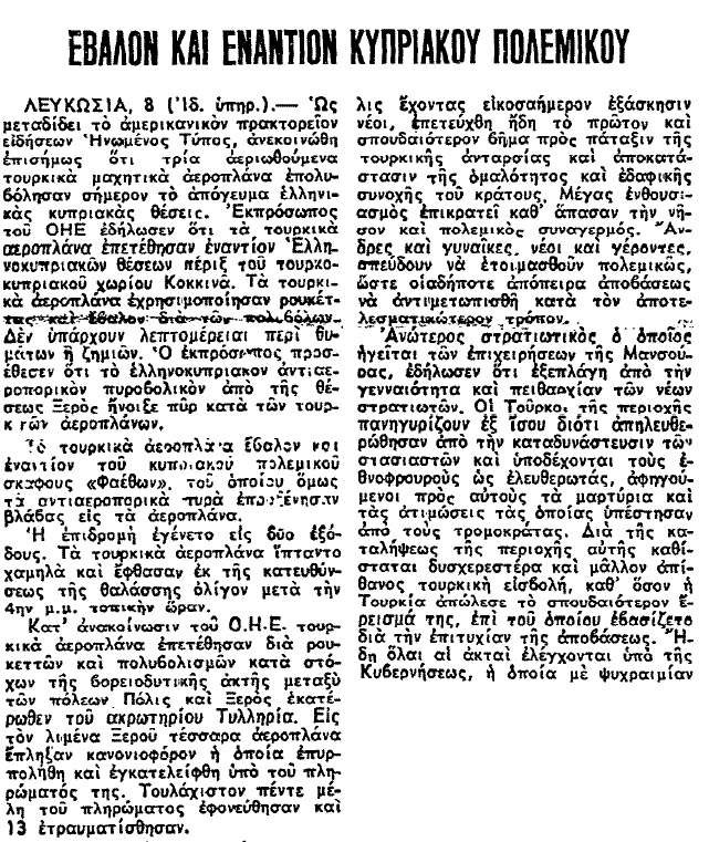«Έστειλα σήμα στη Λευκωσία και είπα ότι αναμένω αεροπορική εχθρική επίθεση. Ποιες είναι οι διαταγές; Είπαν να μείνουμε εκεί και να χτυπήσουμε αφού πρώτα βληθούμε», λέει. Από τα πέντε πολυβόλα του πλοίου όμως μόνο το ένα ήταν λειτουργικό. Σε κάποια είχε γίνει λάθος στους γεμιστήρες από την Ελλάδα, σε άλλα δεν τους είχαν εφοδιάσει με πυρομαχικά.