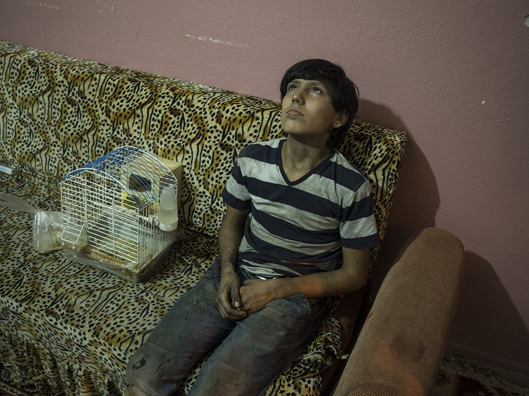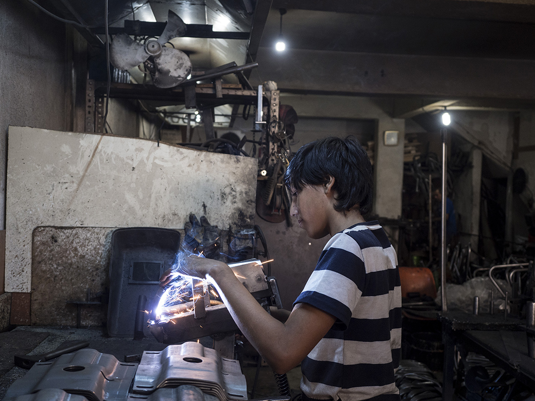 Οι σπινθήρες πετάγονται μια ανάσα από το πρόσωπό του. Ο Ομάρ όμως παραμένει στο πόστο του, σκυφτός πάνω από τα σύνεργα οξυγονοκόλλησης, χωρίς μάσκα ή προστατευτικά γυαλιά. Η βιοτεχνία με τους μαυρισμένους τοίχους είναι το δεύτερο σπίτι του στη Σμύρνη. Κατασκευάζει καρέκλες γραφείου που εξάγονται στα Βαλκάνια. Εργάζεται μέχρι και 11 ώρες την ημέρα, έξι φορές την εβδομάδα – κι ας είναι 14 ετών.