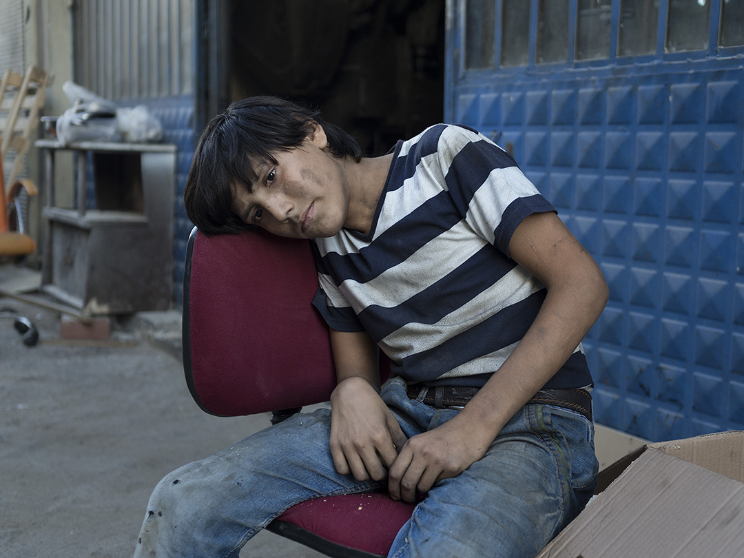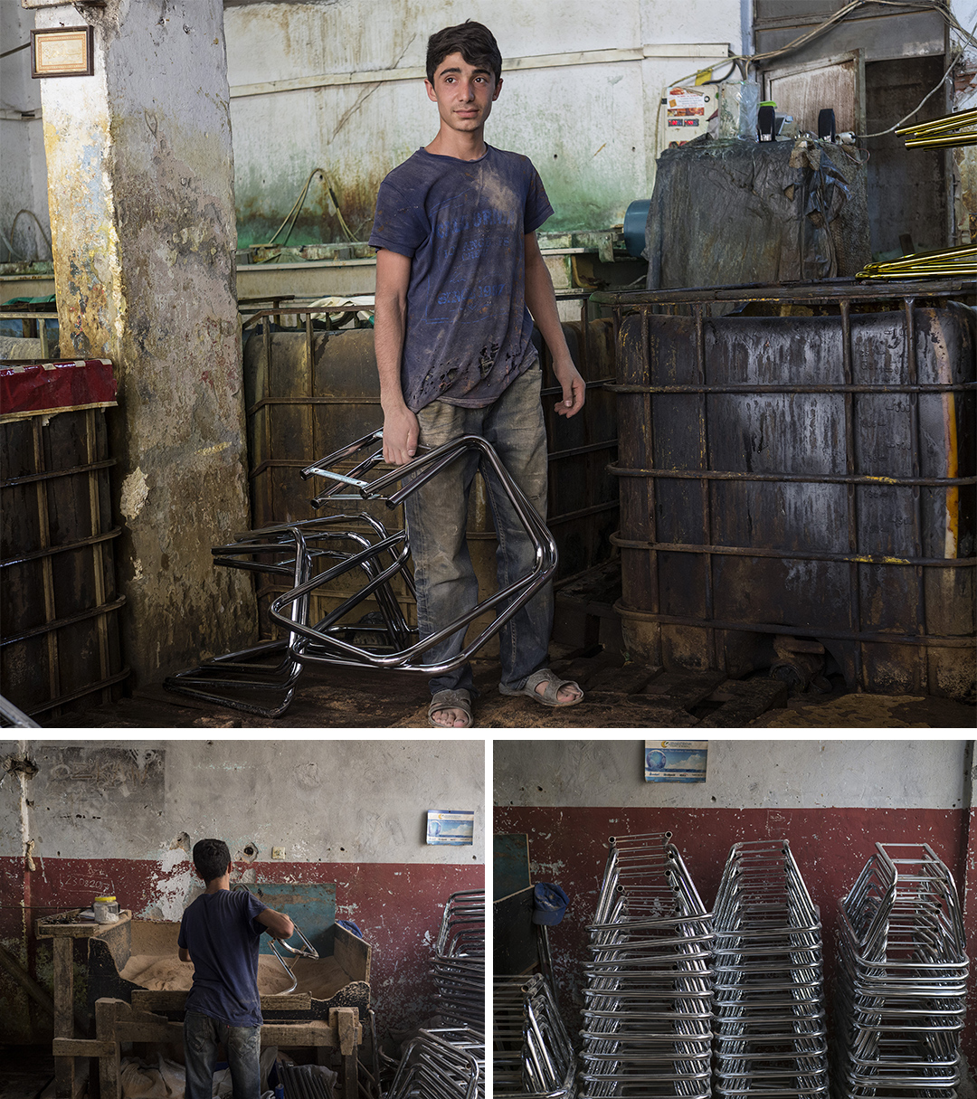 Μερικά τετράγωνα πιο μακριά, σε ένα κτίριο χωρίς επωνυμία και με θαμπές τζαμαρίες, ο 16χρονος Νταγούντ –και αυτός από τη Συρία– κάνει μια από τις βαριές δουλειές: φτιάχνει καρέκλες χρωμίου. Οι μεταλλικοί σκελετοί βυθίζονται πρώτα, από ενήλικους εργάτες, σε δεξαμενές με χημικές ουσίες ή νερό, περνούν από ειδικό μηχάνημα λείανσης και καταλήγουν στο δικό του πόστο. Ο Νταγούντ, φορώντας μια φαγωμένη μπλούζα και παντόφλες στα πόδια, πασπαλίζει τον σκελετό με ροκανίδι και τον τρίβει για να απορροφηθεί κάθε σταγόνα νερού. Έπειτα στοιβάζει τις καρέκλες. Στον ίδιο χώρο εργάζεται και ο ενήλικος αδερφός του.