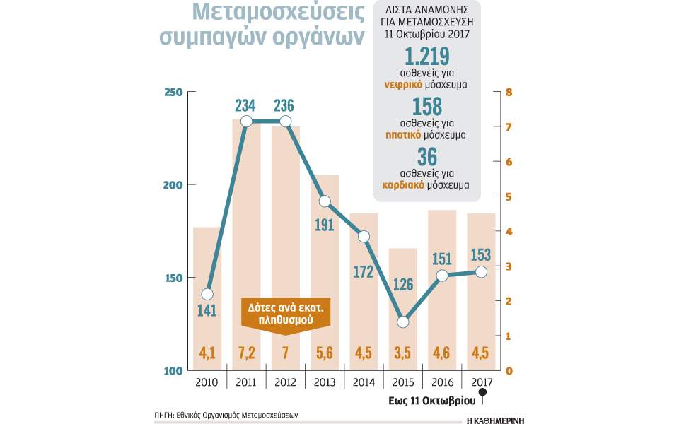 Μέχρι και τα μέσα Οκτωβρίου, η λίστα αναμονής για νεφρικό μόσχευμα στην Ελλάδα αριθμούσε 1.219 ασθενείς, οι οποίοι περιμένουν συνήθως έξι χρόνια μέχρι την επέμβαση. Η δωρεά οργάνων φέτος κυμαίνεται στα περυσινά επίπεδα, αλλά παραμένει μακριά από τον ευρωπαϊκό μέσο όρο που είναι τριπλάσιος από τον ελληνικό. Γιατροί, ασθενείς και μεταμοσχευμένοι τονίζουν ότι χρειάζεται καλύτερη ενημέρωση των πολιτών για να αλλάξει αυτή η εικόνα.