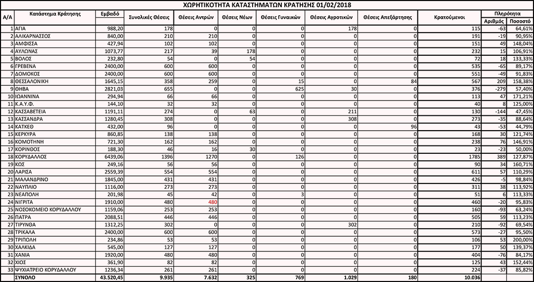 Σύμφωνα με τα πιο πρόσφατα στοιχεία του υπουργείου Δικαιοσύνης, την 1η Φεβρουαρίου 2018 το σύνολο των κρατουμένων στην Ελλάδα ήταν 10.036 άνθρωποι (στη συντριπτική πλειονότητα άντρες, καθώς οι γυναίκες ήταν μόνο 555). «Αυτό είναι το όριο αντοχής του ελληνικού σωφρονιστικού συστήματος, το οποίο δεν πρέπει να υπερβαίνουμε», λέει στην «Κ» ο γενικός γραμματέας Αντεγκληματικής Πολιτικής Ευτύχης Φυτράκης.