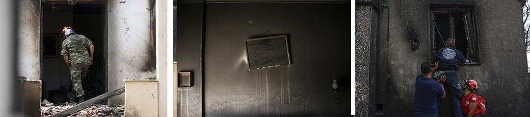 Όσο περπατάμε στα αποκαΐδια του διαμερίσματός της μία από τις ομάδες της Πυροσβεστικής, επιφορτισμένη με την αναζήτηση νεκρών και αγνοουμένων, χτυπάει πόρτες, κοιτάζει από φινιστρίνια μπάνιων. Ανεβοκατεβαίνουν και τους τρεις ορόφους προτού ο επικεφαλής δώσει το σήμα της αναχώρησης. Τουλάχιστον εδώ δεν μετρήθηκε άλλη απώλεια.