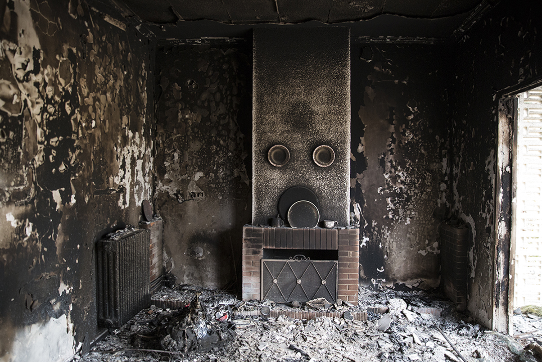Μιλάει για το πώς οι φλόγες κύκλωσαν την πολυκατοικία και πώς ο αέρας όριζε το πού θα χτυπήσουν. Τα σημάδια φαίνονται μπροστά μας. Το πλαϊνό μπαλκόνι της καταστράφηκε. Το υπνοδωμάτιο έμεινε ανέπαφο, αλλά οι φλόγες έπειτα έστριψαν και έλιωσαν τα παντζούρια και το ψυγείο στην κουζίνα.