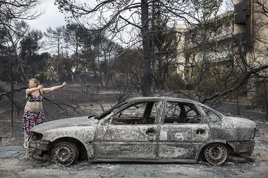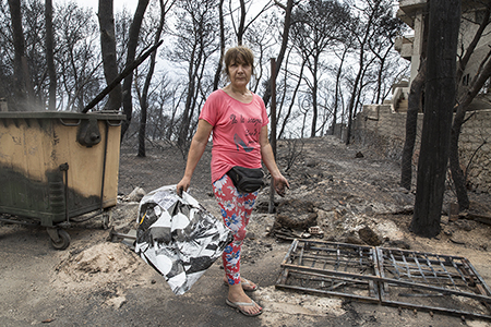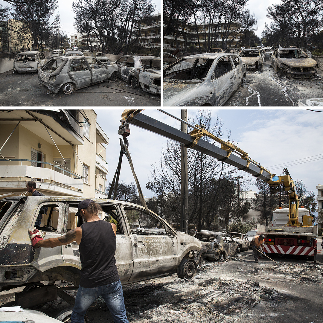 «Ήρθαμε με την εγγονή μου στα γνωστά νερά για να γλιτώσουμε», λέει όσο ψάχνει στα απανθρακωμένα αυτοκίνητα το δικό της. Πάρκαρε βιαστικά την ημέρα της πυρκαγιάς στη λεωφόρο Ποσειδώνος, τον δρόμο στο Μάτι που αν και παραλιακός βλέπει από χαραμάδες τη θάλασσα.