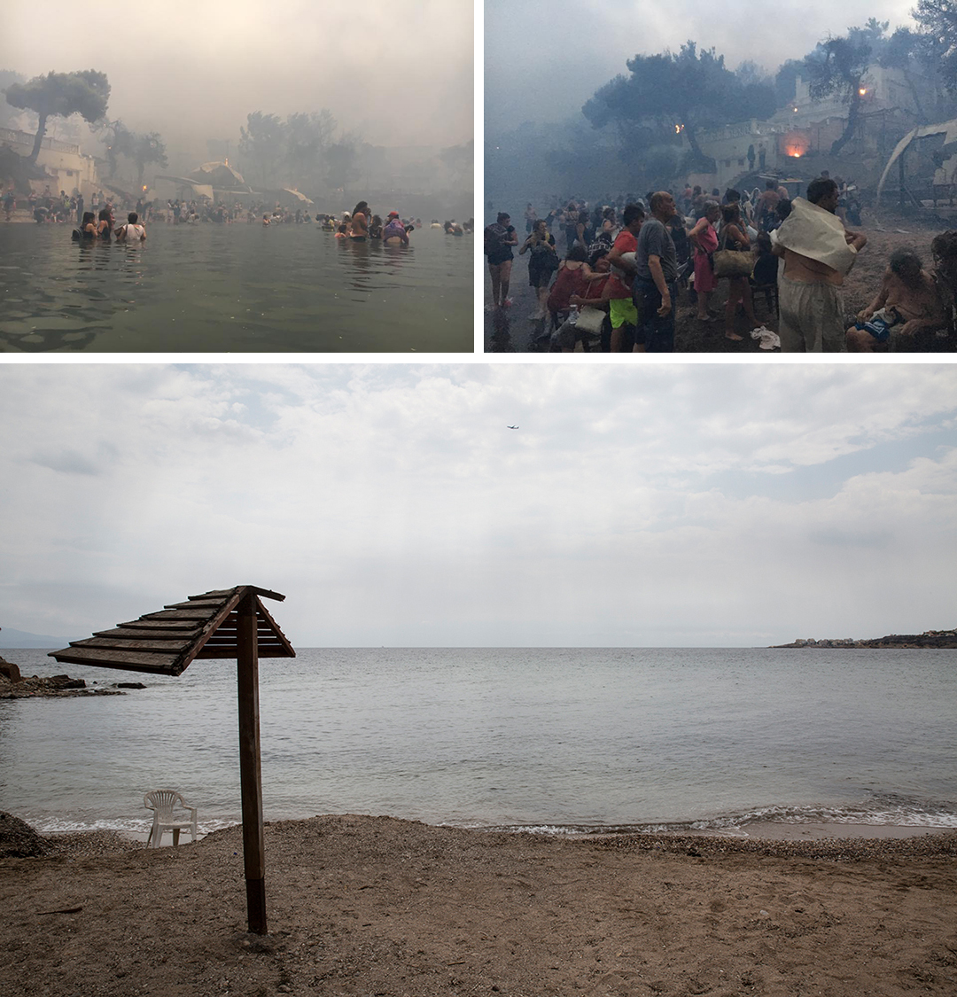 Διέξοδο στη θάλασσα αναζήτησε και ο 62χρονος Γιώργος Ασημάκος. Πέρασε τέσσερις ώρες στο νερό κρατώντας όσο άντεχε το κεφάλι του κάτω από την επιφάνεια για να αποφύγει τον καπνό. «Η θάλασσα έβραζε», λέει. «Στην αρχή καιγόμασταν. Μετά, όταν είχε κοπάσει η φωτιά όσοι είχαμε παπούτσια –γιατί οι περισσότεροι ήταν ξυπόλητοι– ανεβήκαμε στα βράχια. Όσο περνούσε η ώρα, μέχρι να έρθουν βάρκες να μας παραλάβουν, κρυώναμε».