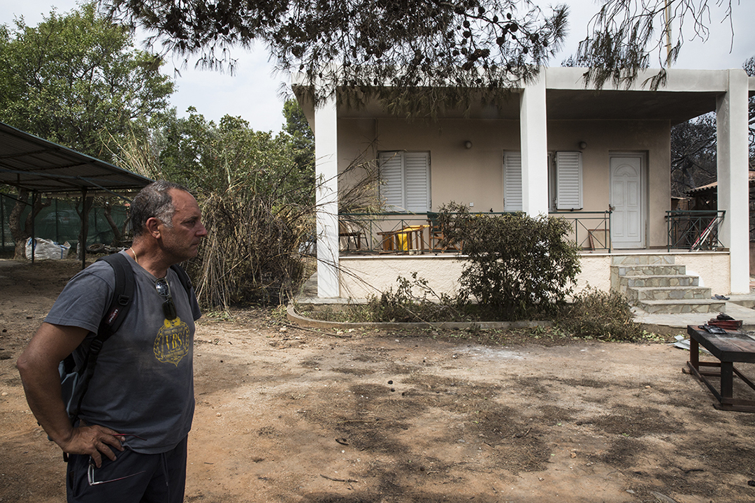 «Ξυπνάμε στον ύπνο μας. Και εγώ ξυπνάω και βλέπω φλόγες», λέει ο κ. Παγώνης όταν μιλάμε ξανά, σχεδόν τρεις εβδομάδες μετά το πέρασμα της φωτιάς στη γειτονιά του και την πρώτη μας συνάντηση. Το απόγευμα της 23ης Ιουλίου δεν ακολούθησε τη σύζυγό του προς τη θάλασσα. Έμεινε πίσω για να σώσει το σπίτι του, παραδέχεται ότι ήταν τυχερός που γλίτωσε και ο ίδιος.