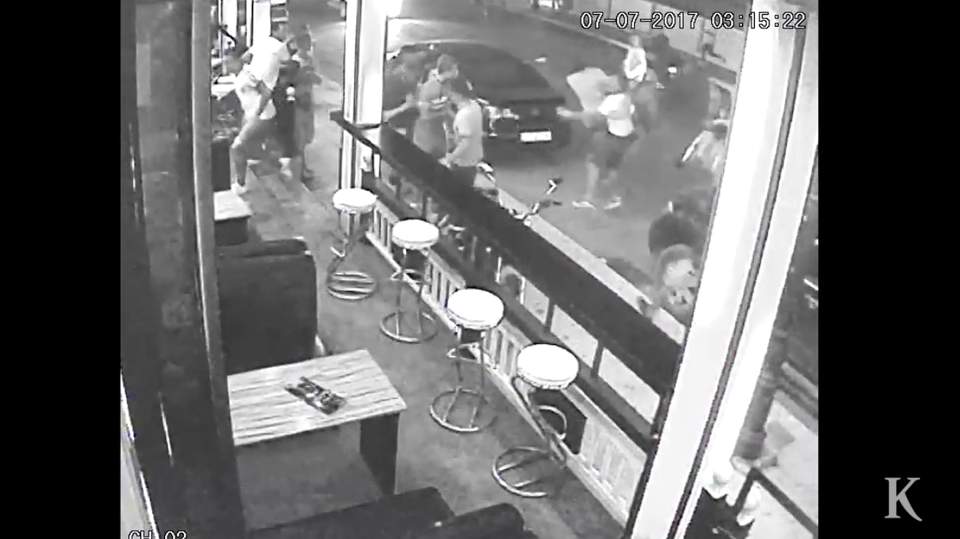 Στο καρέ που έχει στη διάθεσή της η «Κ» φαίνεται η κοπέλα να χαμογελάει, το ίδιο και ο Μπακάρι που οριακά είναι στο κάδρο. Όσο η παρέα διασκέδαζε, ο Σέρβος που είχε κάνει αρχικά την παρατήρηση στην κοπέλα, ρίχνει ένα ποτήρι με νερό προς το μέρος της. Ο Μπακάρι προσπαθεί να την υπερασπιστεί λέγοντάς του κάτι αλλά εκείνος τον χτυπάει στο πρόσωπο. Ο Μπακάρι για λίγα δευτερόλεπτα δεν αντιδρά, παίρνει όμως ένα μπουκάλι μπίρας το σπάει στο κεφάλι του και του ρίχνει δύο μπουνιές. Η κοπέλα προσπαθεί να τους χωρίσει και κατά λάθος τραυματίζεται. Ο πορτιέρης του μαγαζιού, επίσης Σέρβος, μαζί με μερικούς ακόμα άνδρες τρέχουν προς το σημείο. Ο Μπακάρι προσπαθώντας να ξεφύγει φαίνεται να τους ρίχνει ένα τασάκι. Σύμφωνα με τους κατηγορούμενους τους φώναζε προκλητικά «ελάτε, ελάτε».