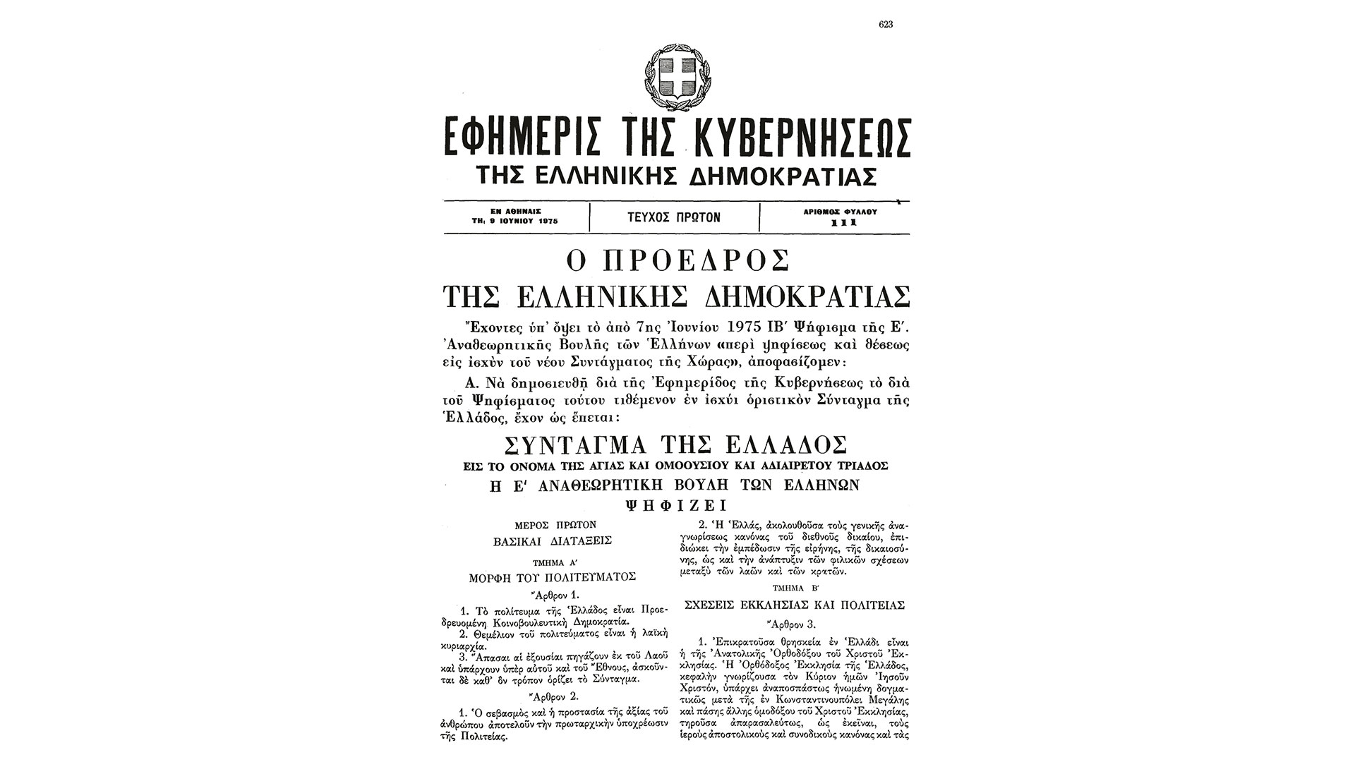 Γιορτάζουμε φέτος τα πενήντα χρόνια του Συντάγματος του 1975 που ψηφίστηκε στις 7, δημοσιεύθηκε στις 9 και άρχισε να ισχύει στις 11 Ιουνίου 1975. Την επόμενη ημέρα ο Κωνσταντίνος Καραμανλής υπέβαλε την αίτηση ένταξης στις τότε Ευρωπαϊκές Κοινότητες. Η συμμετοχή της χώρας στις διεργασίες της ευρωπαϊκής ολοκλήρωσης ήταν μία από τις θεμελιώδεις συνταγματικές αποφάσεις της πρώιμης φάσης της Μεταπολίτευσης, ακόμη κι αν δεν μνημονεύεται ρητώς στον σκληρό πυρήνα των μη υποκείμενων σε αναθεώρηση διατάξεων του άρθρου 110 παρ. 1. Αυτό κατέστη ρητός συνταγματικός κανόνας το 2001 με την προσθήκη σχετικής ερμηνευτικής δήλωσης στο άρθρο 28.