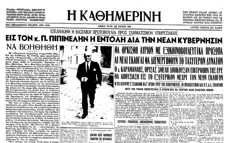 Η σύγκρουση του βασιλιά Παύλου και του Κωνσταντίνου Καραμανλή για το επικείμενο βασιλικό ταξίδι στο Λονδίνο, σε μια περίοδο μεγάλης κρίσης στις ελληνοβρετανικές σχέσεις, έληξε στις 17 Ιουνίου. «Ραγδαίαι εξελίξεις ωδήγησαν χθες την 2.30΄ μ.μ. εις την ανάθεσιν της εντολής σχηματισμού […] νέας Κυβερνήσεως», αναφέρει στο πρωτοσέλιδό της η «Καθημερινή» της 18ης Ιουνίου 1963. Ο Καραμανλής παραιτήθηκε και, στη συνέχεια, έφυγε από τη χώρα, αναθέτοντας την προεδρεία της ΕΡΕ σε τριμελή διοικητική επιτροπή, υπό τους Π. Κανελλόπουλο, Κ. Ροδόπουλο και Π. Παπαληγούρα.