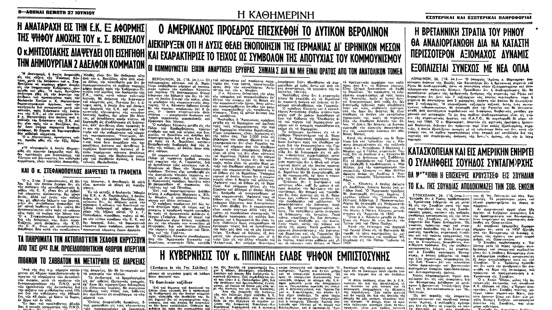 «Ο πρόεδρος Κέννεντυ μετέβη εις την Πύλην του Βραδεμβούργου, πρώτον σταθμόν του προ του τείχους που διαχωρίζει το Βερολίνον και ανήλθεν επί παρατηρητηρίου διά να ρίψη ένα βλέμμα προς το Α. Βερολίνον, κατόπιν θριαμβευτικής διαδρομής ανά τας οδούς της πόλεως, αι οποίαι ήσαν πλήρεις κόσμου», έγραφε η «Καθημερινή» στις 27 Ιουνίου. «Οι κομμουνισταί είχον καλύψει την Πύλην με τεράστια ερυθρά “πανώ” και σημαίας της Α. Γερμανίας, διά να εμποδίσουν τους κατοίκους του Α. Βερολίνου να ίδουν τον Αμερικανόν πρόεδρον. Επίσης είχε τοποθετηθή εις την ανατολικήν πλευράν τεραστία πινακίς με επιγραφήν, διά της οποίας ο Αμερικανός πρόεδρος ηρωτάτο πότε θα εφαρμοσθούν αι συμφωνίαι της Γυάλτας και του Πότσδαμ. […] Ο πρόεδρος παρέμεινεν επί δύο λεπτά ατενίζων προς το τείχος και εν συνεχεία η προεδρική πομπή κατηυθύνθη προς το αμερικανικόν φυλάκιον ελέγχου “Τσάρλυ”, όπου αι αρχαί του Α. Βερολίνου είχον επίσης τοποθετήσει εις την πλευράν των πινακίδας με επιγραφάς, διά των οποίων εζήτουν την τήρησιν των συμφωνιών του Πότσδαμ και της Γυάλτας».