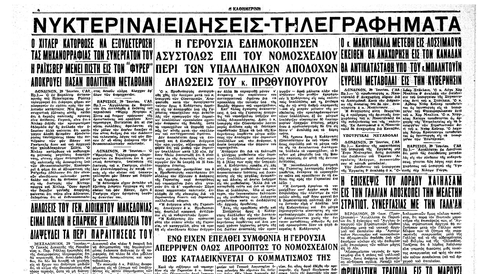 «Εξερράγη επαναστατικόν κίνημα εν Γερμανία. Εφονεύθησαν ο πρώην καγκελλάριος Φον Σλάιχερ, η σύζυγός του και ο αρχηγός του επιτελείου των ταγμάτων εφόδου Ερνστ Ρεμ. Επίσης ετυφεκίσθησαν έτεροι επτά ηγέται των ταγμάτων εφόδου», γράφει στο πρωτοσέλιδό της η «Καθημερινή» της 1ης Ιουλίου 1934. Η νύχτα των μεγάλων μαχαιριών, όπως έμεινε γνωστό στην ιστορία το αιματηρό τριήμερο εκκαθαρίσεων στο Εθνικοσοσιαλιστικό Κόμμα της Γερμανίας, είχε μόλις ξεκινήσει.