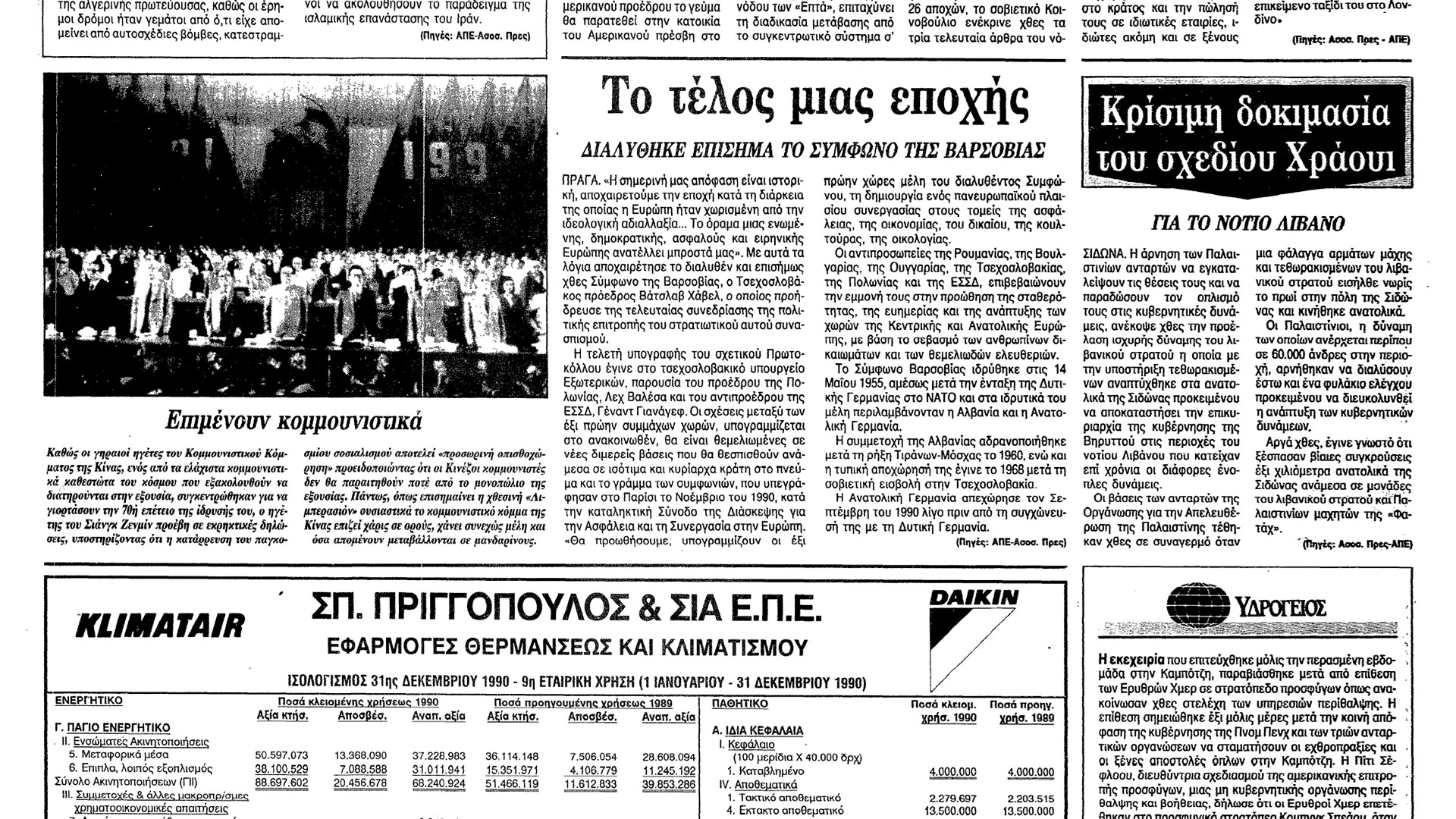 Η «Καθημερινή» δημοσίευσε τις δηλώσεις του Τσεχοσλοβάκου προέδρου Βάτσλαβ Χάβελ για το τέλος του Συμφώνου: «Η σημερινή μας απόφαση είναι ιστορική, αποχαιρετούμε την εποχή κατά τη διάρκεια της οποίας η Ευρώπη ήταν χωρισμένη από την ιδεολογική αδιαλλαξία. […] Το όραμα μιας ενωμένης, δημοκρατικής, ασφαλούς και ειρηνικής Ευρώπης ανατέλλει μπροστά μας». Στο ίδιο άρθρο επισημαίνεται ότι «η τελετή υπογραφής του σχετικού Πρωτοκόλλου έγινε στο τσεχοσλοβακικό υπουργείο Εξωτερικών, παρουσία του προέδρου της Πολωνίας Λεχ Βαλέσα και του αντιπροέδρου της ΕΣΣΔ, Γέναντ Γιανάγεφ. Οι σχέσεις μεταξύ των έξι πρώην συμμάχων, υπογραμμίζεται στο ανακοινωθέν, θα είναι θεμελιωμένες σε διμερείς βάσεις που θα θεσπιστούν ανάμεσα σε ισότιμα και κυρίαρχα κράτη στο πνεύμα και το γράμμα των συμφωνιών που υπεγράφησαν στο Παρίσι το Νοέμβριο του 1990, κατά την καταληκτική Σύνοδο της Διάσκεψης για την Ασφάλεια και τη Συνεργασία στην Ευρώπη».