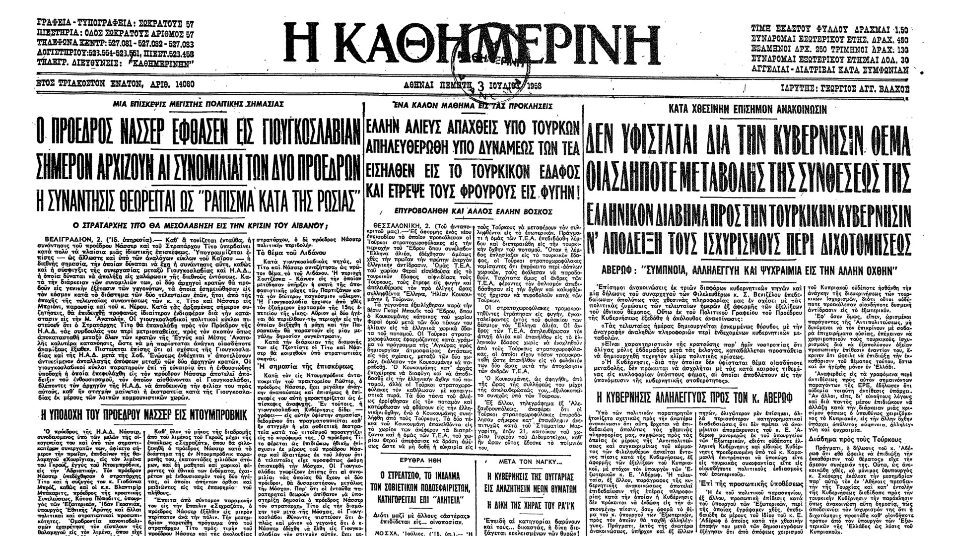 Στο πλαίσιο της προσπάθειας σύσφιξης των διμερών σχέσεων και της συζήτησης για τα φλέγοντα διεθνή ζητήματα, ο Αιγύπτιος ηγέτης πραγματοποίησε στις 2 Ιουλίου 1958 επίσκεψη στη Γιουγκοσλαβία. Στο πρωτοσέλιδο της 3ης Ιουλίου, η «Καθημερινή» χαρακτήρισε την συνάντηση Τίτο-Νάσσερ ως «ράπισμα κατά της Ρωσίας». Η εφημερίδα ανέφερε μεταξύ άλλων ότι «η συνάντησις του προέδρου Νάσσερ και του Στρατάρχου Τίτο υπερβαίνει κατά πολύ τα πλαίσια μιας ιδιωτικής επισκέψεως. Υπογραμμίζεται επίσης – ως άλλωστε και υπό των αναλόγων κύκλων του Καΐρου – η διεθνής σημασία, την οποίαν δύναται να έχη η συνάντησις αύτη, καθώς και η σύσφιγξις της συνεργασίας μεταξύ Γιουγκοσλαβίας και Η.Α.Δ., η οποία δύναται να απολήξη εις χαλάρωσιν της διεθνούς εντάσεως. Κατά την διάρκειαν των συνομιλιών των, οι δύο αρχηγοί κρατών θα προβούν εις γενικήν εξέτασιν των γεγονότων, τα οποία εσημειώθησαν εις τον κόσμον κατά το διάστημα των δύο τελευταίων ετών, ήτοι από της εποχής της τελευταίας συναντήσεως των κ.κ. Τίτο και Νάσσερ εις Μπριόνι, παρουσία και του κ. Νέρου».