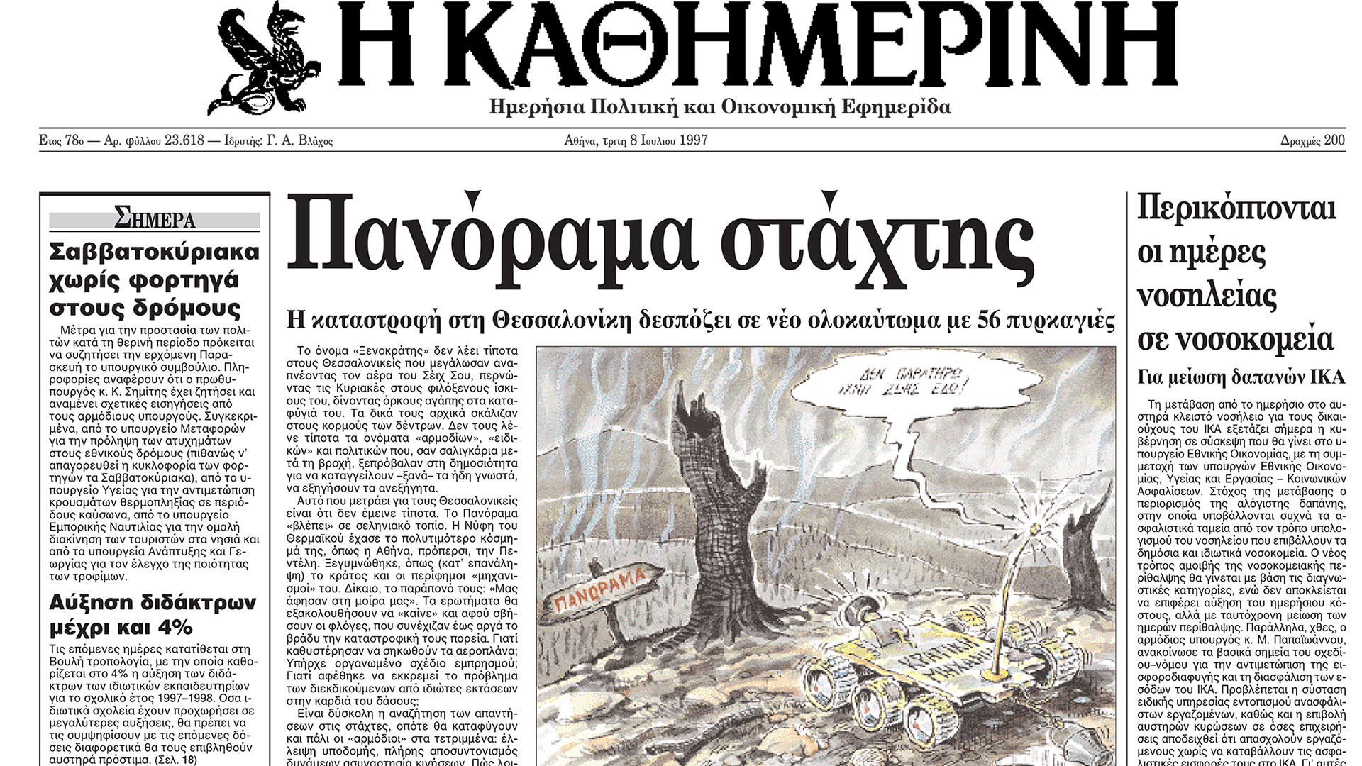 Στις 7 Ιουλίου του 1997, ξέσπασε πυρκαγιά στον πνεύμονα της Θεσσαλονίκης, το Σέιχ Σου, προκαλώντας μεγάλη οικολογική καταστροφή στην πόλη, η οποία μάλιστα ήταν τότε Πολιτιστική Πρωτεύουσα της Ευρώπης. Μπήκε σε εφαρμογή το Σχέδιο «Ξενοκράτης» από τον κρατικό μηχανισμό για τον περιορισμό και εν τέλει κατάσβεση της πυρκαγιάς. Ωστόσο, όπως αναφέρει η «Καθημερινή» στις 8 Ιουλίου 1997 στο πρωτοσέλιδό της, «το όνομα “Ξενοκράτης” δεν λέει τίποτα στους Θεσσαλονικείς που μεγάλωσαν αναπνέοντας τον αέρα του Σέιχ Σου, περνώντας τις Κυριακές στους φιλόξενους ίσκιους του, δίνοντας όρκους αγάπης στα καταφύγιά του. Τα δικά τους αρχικά σκάλιζαν στους κορμούς των δέντρων. Δεν τους λένε τίποτα τα ονόματα “αρμοδίων”, “ειδικών” και πολιτικών που […] ξεπρόβαλαν στη δημοσιότητα για να καταγγείλουν –ξανά– τα ήδη γνωστά, να εξηγήσουν τα ανεξήγητα. Αυτό που μετράει για τους Θεσσαλονικείς είναι ότι δεν έμεινε τίποτα. Το Πανόραμα “βλέπει” σε σεληνιακό τοπίο. Η Νύφη του Θερμαϊκού έχασε το πολυτιμότερο κόσμημά της, όπως η Αθήνα, πρόπερσι, την Πεντέλη. Ξεγυμνώθηκε, όπως (κατ’ επανάληψη) το κράτος και οι περίφημοι “μηχανισμοί” του».