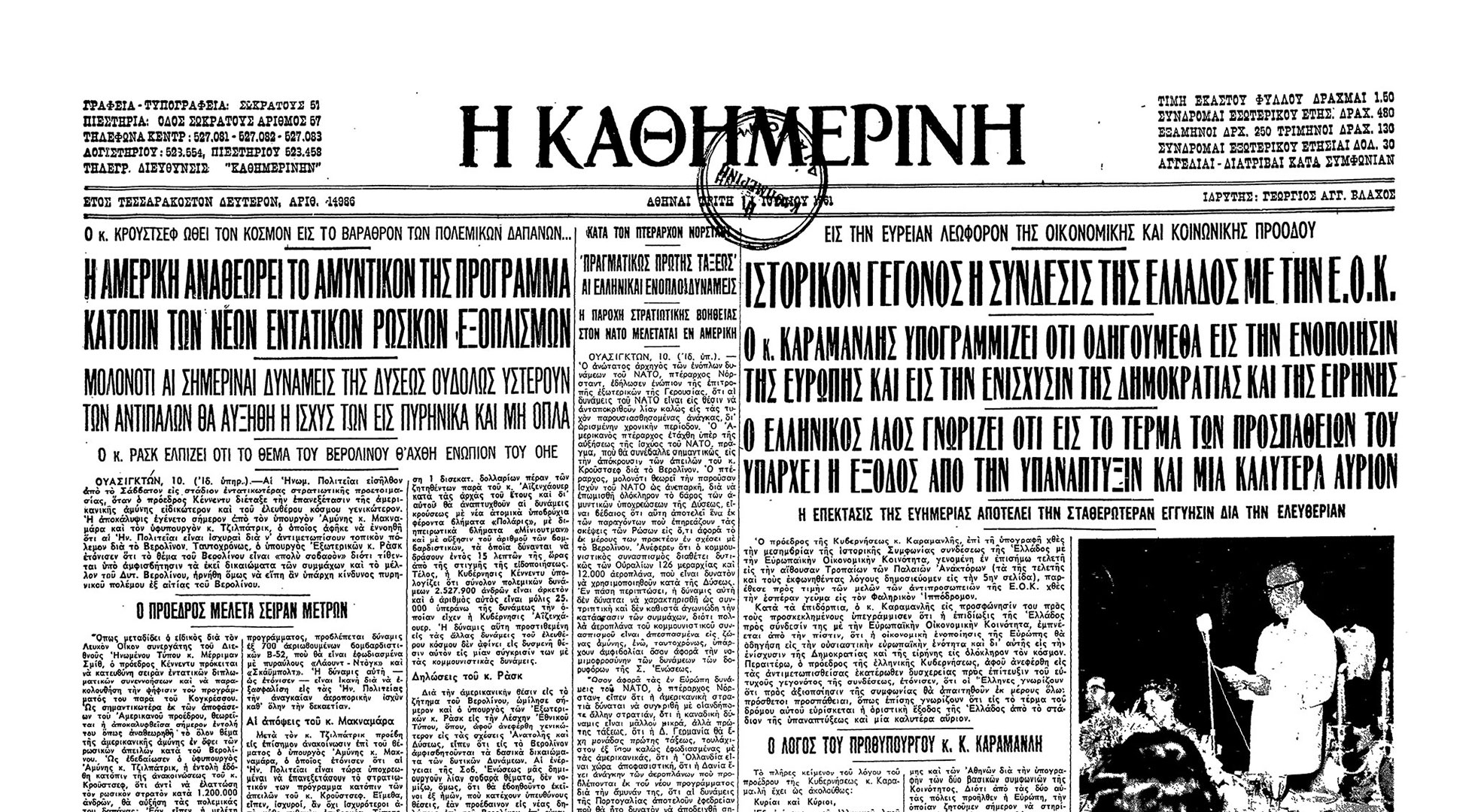 Η «Καθημερινή» κάλυψε εκτενώς το ιστορικό γεγονός της υπογραφής της συμφωνίας για τη Σύνδεση της Ελλάδας με την ΕΟΚ. «Η ιστορικής διά την Ελλάδα σημασίας τελετή υπογραφής της συμφωνίας δια την σύνδεσιν της χώρας με την Ευρωπαϊκήν Οικονομικήν Κοινότητα, έγινε την 11.30 πρωινήν της Κυριακής εις την αίθουσαν των Τροπαίων των Παλαιών Ανακτόρων, παρουσία πολλών διεθνών προσωπικοτήτων», ανέφερε στις σελίδες της η «Καθημερινή» της 11ης Ιουλίου 1961.