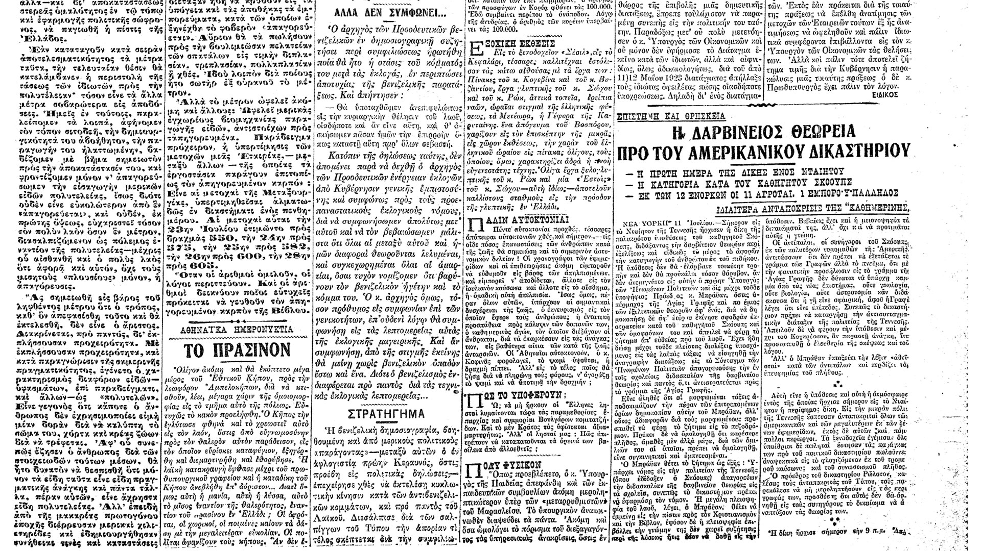 «Σήμερον εις το Νταίητον της Τεννεσής ήρχισεν η δίκη της πολυκρότου υποθέσεως του καθηγητού Σκόουπς, διδάξαντος την δαρβίνειον θεωρίαν περί εξελίξεως και ειδικώς το μέρος το αφορών την καταγωγήν του ανθρώπου εκ του πιθήκου», έγραφε η «Καθημερινή» αρκετές ημέρες μετά την έναρξη της δίκης, η οποία διήρκεσε από τις 10 έως τις 21 Ιουλίου. Η δίκη αυτή, που έμεινε γνωστή με το όνομα που της είχαν δώσει οι εφημερίδες της εποχής ως η «Δίκη των Πιθήκων», έλαβε πολύ μεγάλη δημοσιότητα, κυρίως εξαιτίας των αγορεύσεων στο δικαστήριο.