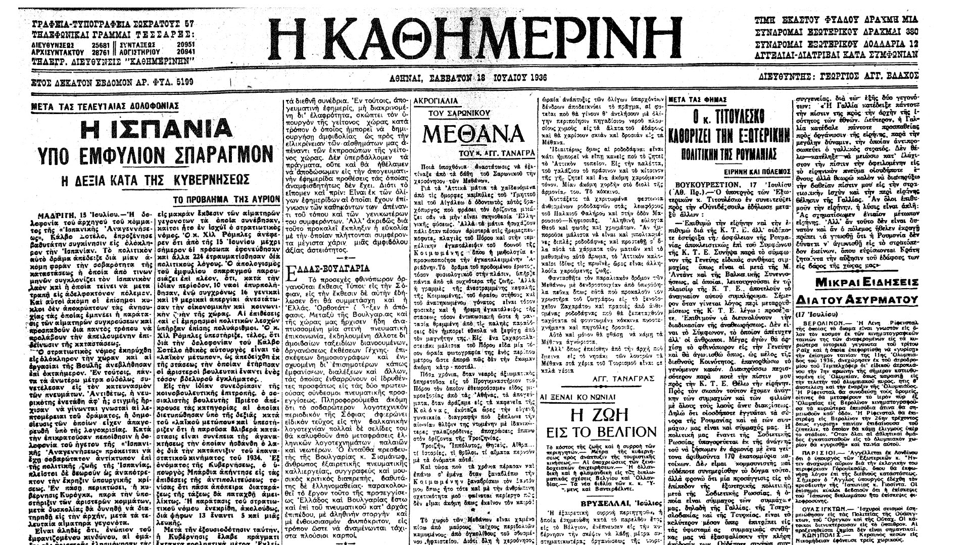 Στο πρωτοσέλιδό της την 18η Ιουλίου 1936, η «Καθημερινή» δημοσίευε ένα άρθρο με τίτλο «Μετά τας τελευταίας δολοφονίας – Η Ισπανία υπό εμφύλιον σπαραγμόν – Η Δεξιά κατά της Κυβερνήσεως».