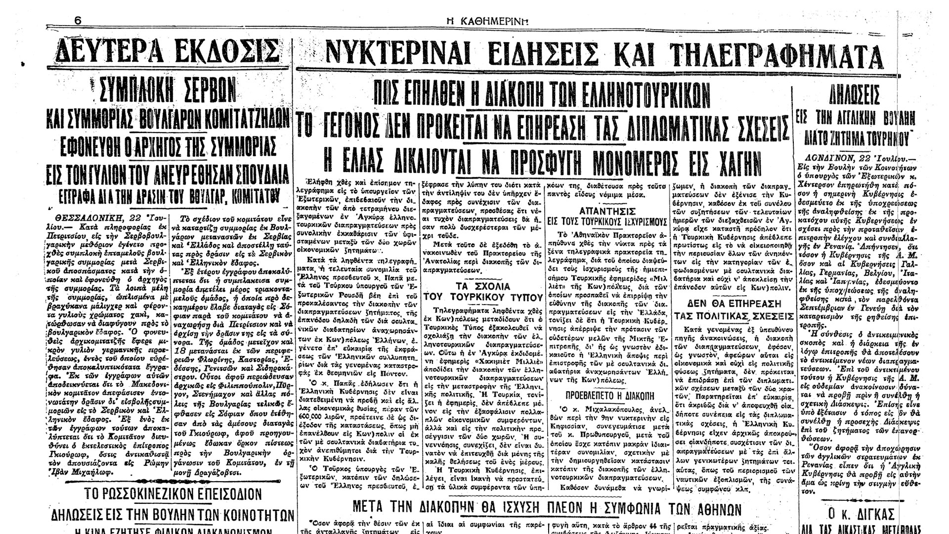Η «Καθημερινή» της 23ης Ιουλίου 1929 αναφέρει τα εξής: «Ελήφθη χθες και επίσημον τηλεγράφημα εις το υπουργείον των Εξωτερικών, επιβεβαιούν την διακοπήν των από τετραμήνου διεξαγομένων διαπραγματεύσεων προς συνολικήν εκκαθάρισιν των υφισταμένων μεταξύ των δύο χωρών οικονομικών ζητημάτων. […] Ο κ. Παπάς εδήλωσεν ότι η Ελληνική Κυβέρνησις δεν είναι διατεθειμένη να προβή και εις άλλας οικονομικάς θυσίας, πέραν των 600.000 λιρών, προέτεινε δε ως διέξοδον της καταστάσεως όπως μη επανέλθουν εις Κων/πόλιν οι εκ των με σουλτανικά διαβατήρια τυχόν ανεπιθύμητοι διά την Τουρκικήν Κυβέρνησιν. Ο Τούρκος υπουργός των Εξωτερικών, κατόπιν των δηλώσεων του Έλληνος πρεσβευτού, εξέφρασε την λύπην του διότι κατά την αντίληψίν του δεν υπήρχεν έδαφος προς συνέχισιν των διαπραγματεύσεων, προσθέσας ότι νέαι τυχόν διαπραγματεύσεις θα ήσαν πολύ δυσχερέστεραι των μέχρι τούδε. Μετά τούτο δε εξεδόθη το ανακοινωθέν του Πρακτορείου της Ανατολίας περί διακοπής των διαπραγματεύσεων». Η «Καθημερινή» αναφέρεται επίσης στα δημοσιεύματα του τουρκικού Τύπου, καθώς και στην αναφορά τους περί μεταστροφής της ελληνικής πολιτικής.