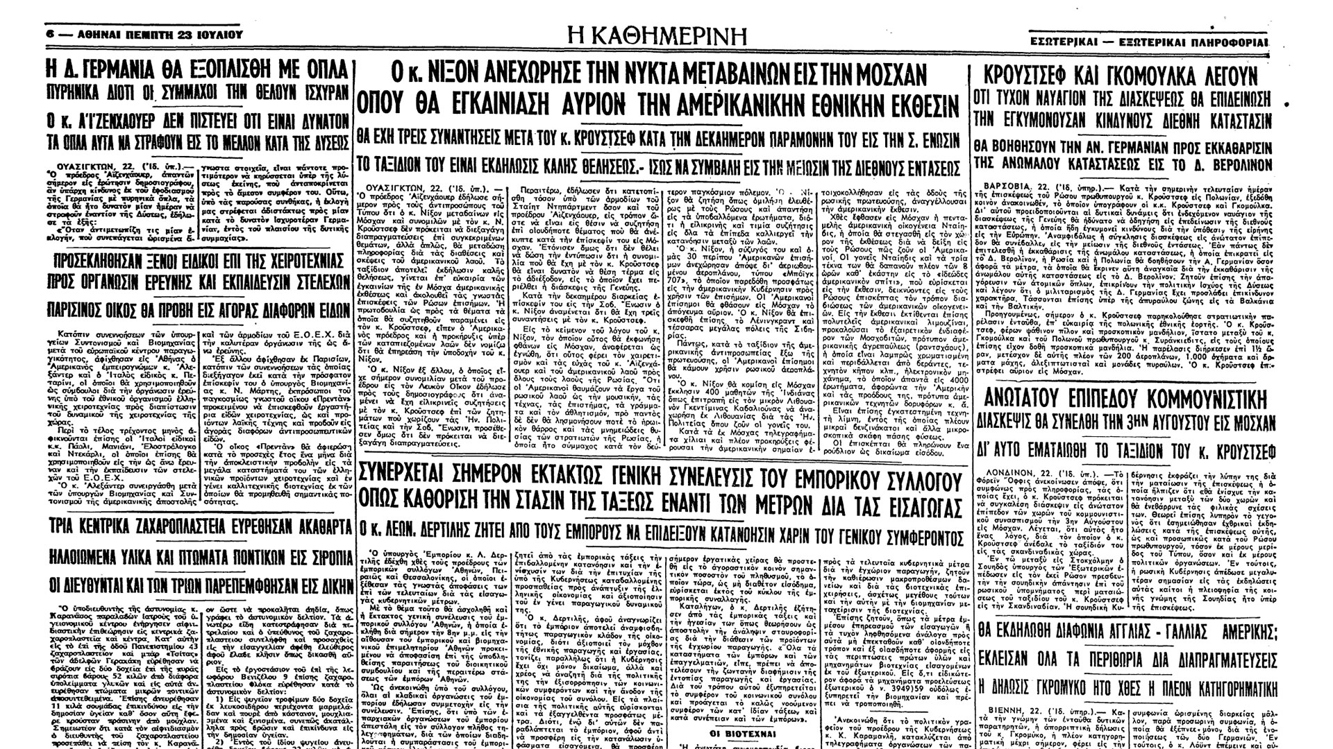 Για τα εγκαίνια της αμερικανικής έκθεσης, μετέβη στη Μόσχα στις 23 Ιουλίου 1959 ο αντιπρόεδρος των ΗΠΑ, Ρίτσαρντ Νίξον. Όπως μετέδωσε η «Καθημερινή» στο φύλλο της ημέρας εκείνης, ο Αμερικανός αντιπρόεδρος μετέβαινε στη Μόσχα επιθυμώντας «να έχη ειλικρινείς συζητήσεις με τον κ. Κρούστσεφ επί των ζητημάτων που χωρίζουν τας Ην. Πολιτείας και την Σοβ. Ένωσιν, προσέθεσεν όμως ότι δεν πρόκειται να διεξαγάγη διαπραγματεύσεις».