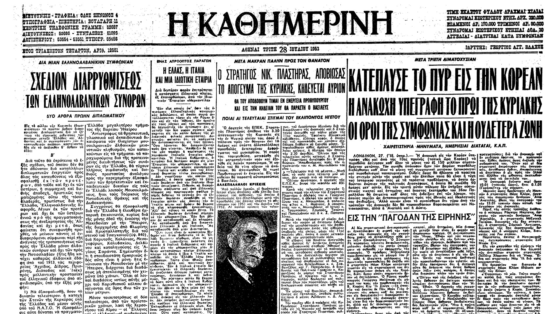 Το σχόλιο της «Καθημερινής» στις 28 Ιουλίου 1953 αποτύπωσε με γλαφυρό τρόπο την πραγματικότητα μετά τη λήξη του πολέμου της Κορέας. «Ουδείς όμως θα ηδύνατο να προείπη την στιγμήν αυτήν της χαράς και των ελπίδων ποία θα είναι η τύχη του ιστορικού γεγονότος με τα τεράστια προβλήματα, τα οποία ορθούνται ενώπιον της πολιτικής Διασκέψεως, η οποία θα συνέλθη 90 ημέρας μετ’ αυτήν. Εις τον τριετήν αυτόν πόλεμον δεν υπήρξαν ουσιαστικώς νικηταί και ηττημένοι και έκαστος εκατέρωθεν του 38ου Παραλλήλου θα επιμείνη καθ’ όλας τα ενδείξεις επί των λύσεων, τας οποίας νομίζει ως ανταποκρινομένας προς τας εθνικάς και ιδεολογικάς του επιδιώξεις. Αλλά κοινόν είναι το συναίσθημα ότι γύρω από την τράπεζαν της ανακωχής δεν θα παρακαθήσουν Βορειοκορεάται και Νοτιοκορεάται, αλλά η Ανατολή και η Δύσις».
