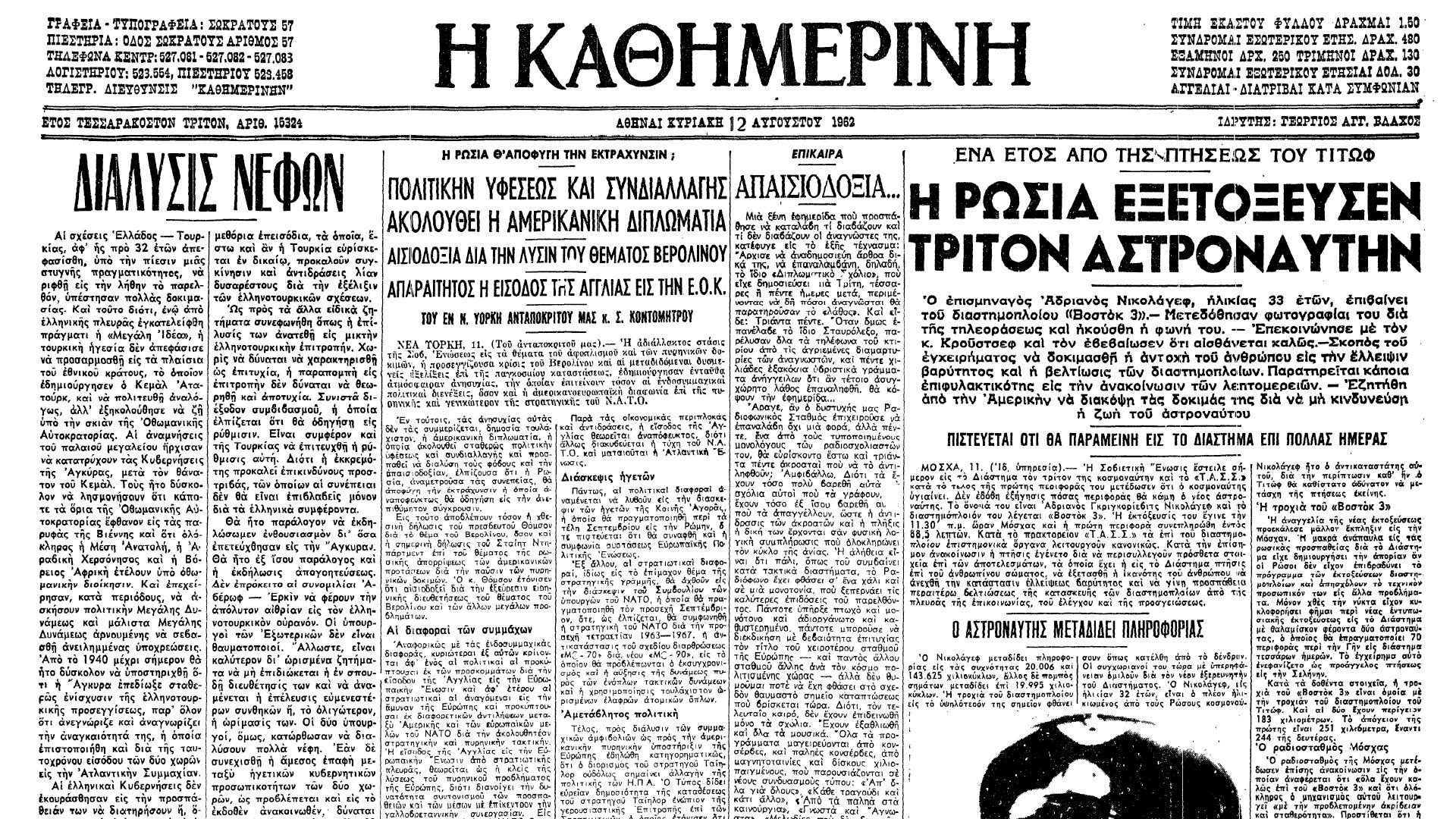 Στις 11 Αυγούστου 1962, ο τρίτος κοσμοναύτης Νικολάγεφ που «εκτόξευσεν η Ρωσία ένα έτος από της πτήσεως του Τιτώφ», όπως αναφέρει χαρακτηριστικά στο πρωτοσέλιδό της η «Καθημερινή» της 12ης Αυγούστου, θα έφτανε στο διάστημα. Θα ήταν ο πρώτος που θα μετέδιδε εικόνες και του οποίου θα ακουγόταν η φωνή μέσω της τηλεόρασης.