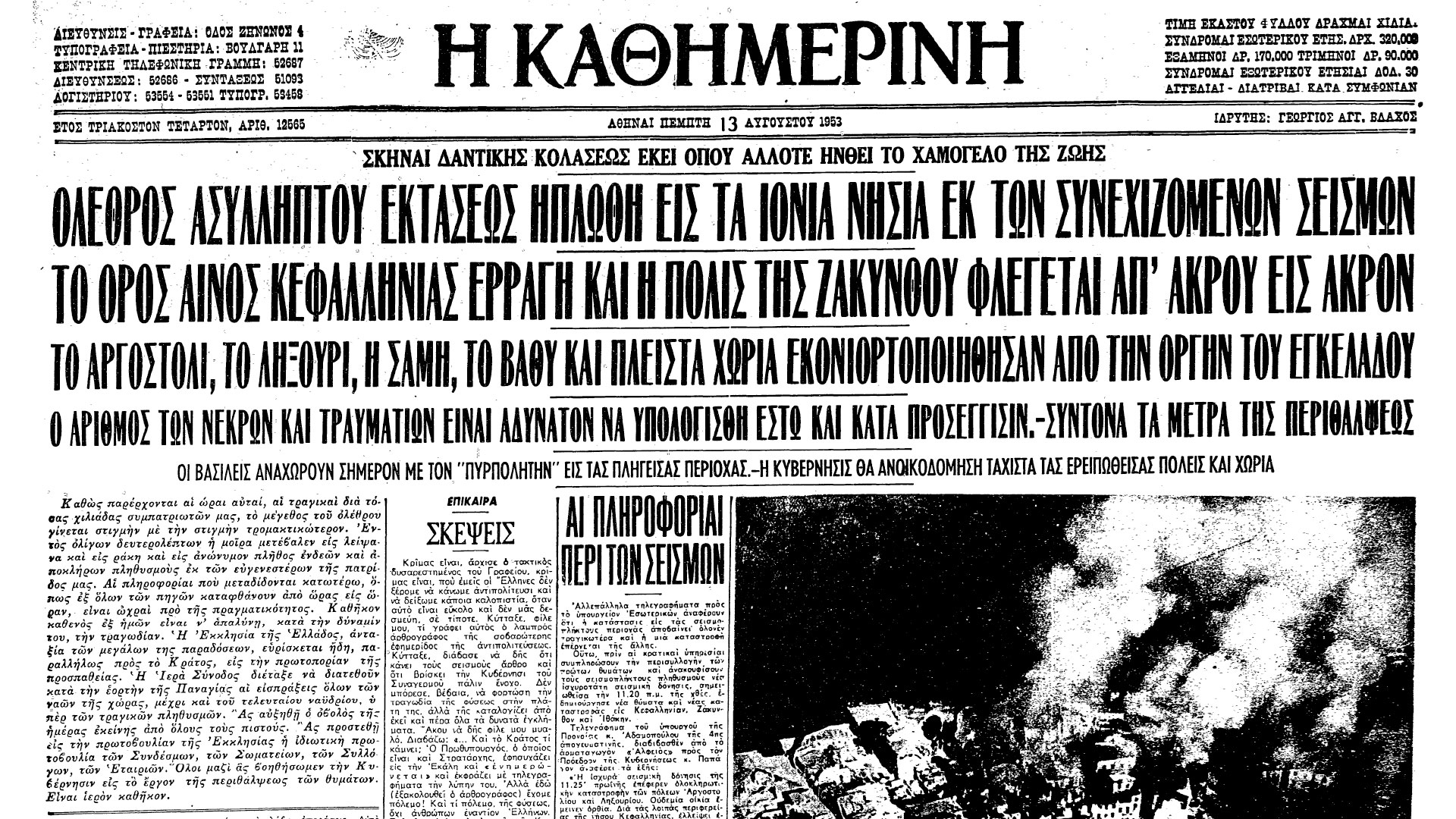 «Σκηναί Δαντικής Κολάσεως εκεί όπου άλλοτε ήνθει το χαμόγελο της ζωής», γράφει στο πρωτοσέλιδό της η «Καθημερινή» της 13ης Αυγούστου 1953. Οι πόλεις και τα χωριά της Ζακύνθου, της Κεφαλονιάς και της Ιθάκης καταστράφηκαν ολοσχερώς από τον μεγαλύτερο σεισμό που έχει καταγραφεί στη χώρα, έντασης 7,2 βαθμών της κλίμακας Ρίχτερ, με τραγικό αποτέλεσμα, 871 ανθρώπους νεκρούς, 1.690 τραυματίες και 145.052 αστέγους.
