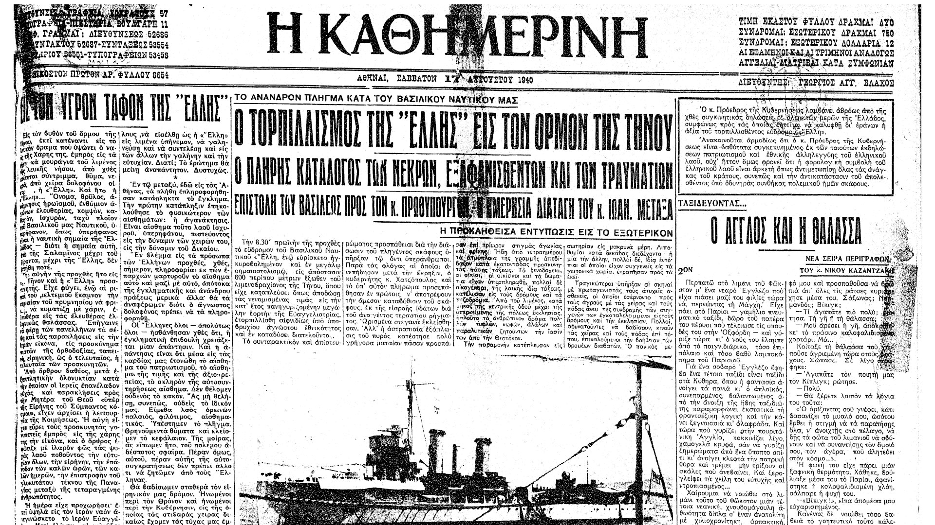 Στις 17 Αυγούστου, η «Καθημερινή» παρέθεσε αναλυτικό ρεπορτάζ για τον τορπιλισμό της «Έλλης» στο λιμάνι της Τήνου. «Την 8.30΄ πρωινήν της προχθές το εύδρομον του Βασιλικού Ναυτικού “Έλλη”, ενώ ευρίσκετο ηγκυροβολημένον και εν μεγάλω σημαιοστολισμώ, εις απόστασιν 800 περίπου μέτρων έξωθεν του λιμενοβραχίονος της Τήνου, όπου είχε καταπλεύση όπως αποδώση τας νενομισμένας τιμάς εις την κατ’ έτος πανηγυριζομένην μεγάλην εορτήν της Ευαγγελιστρίας, ετορπιλλήσθη αιφνιδίως υπό υποβρυχίου αγνώστου εθνικότητος και εν καταδύσει διατελούντος.