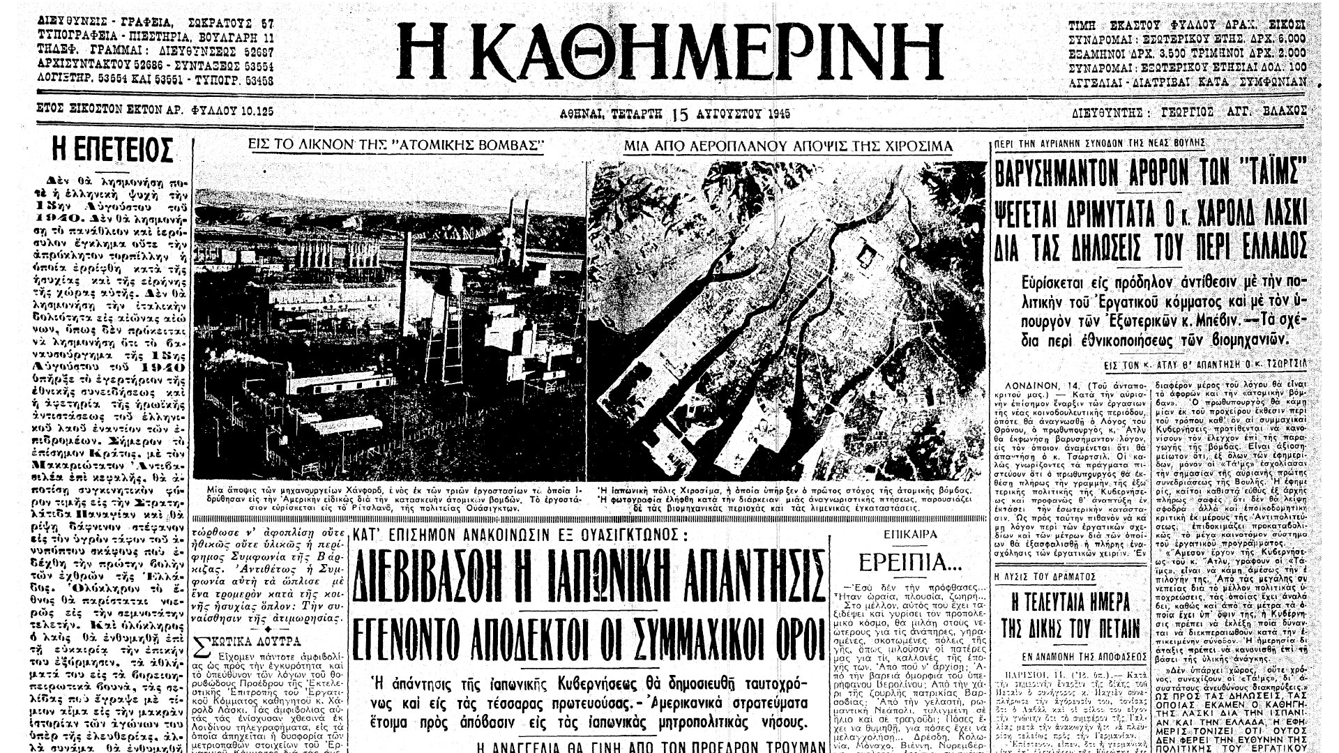 Οι εξελίξεις στην Άπω Ανατολή απασχόλησαν ουκ ολίγες φορές την «Καθημερινή» μέσα στο καλοκαίρι του 1945. Στις 15 Αυγούστου η «Καθημερινή» έγραψε στο πρωτοσέλιδό της ότι «κατά τηλεγραφήματα εξ Ουασιγκτώνος, επίσημος ανακοίνωσις, εκδοθείσα εκ του Λευκού Οίκου προ μιας ώρας, αναφέρει ότι η ιαπωνική απάντησις έφθασεν εις το εν Βέρνη υπουργείον των Εξωτερικών προ τεσσάρων ωρών». Σύμφωνα με την ανακοίνωση του ελβετικού ραδιοσταθμού, «η Ιαπωνία απεδέχθη την πρότασιν συνθηκολογήσεως. Το Ιαπωνικόν Γραφείον Πληροφοριών ανήγγειλε σήμερον την πρωίαν, επί τη βάσει ανακοινώσεως του ιαπωνικού υπουργείου των Στρατιωτικών, την αποδοχήν των συμμαχικών όρων συνθηκολογήσεως. Κατά την πρωίαν σήμερον το Ελβετικόν Πρακτορείον Ειδήσεων έλαβεν από το Ιαπωνικόν Πρακτορείον Ειδήσεων “Ντομέι” είδησιν κατά την οποίαν θα εκδοθή εντός ολίγου και θα μεταδοθή διάγγελμα του Αυτοκράτορος της Ιαπωνίας διά του οποίου θα γίνεται αποδεκτή η διακήρυξις του Πότσδαμ».