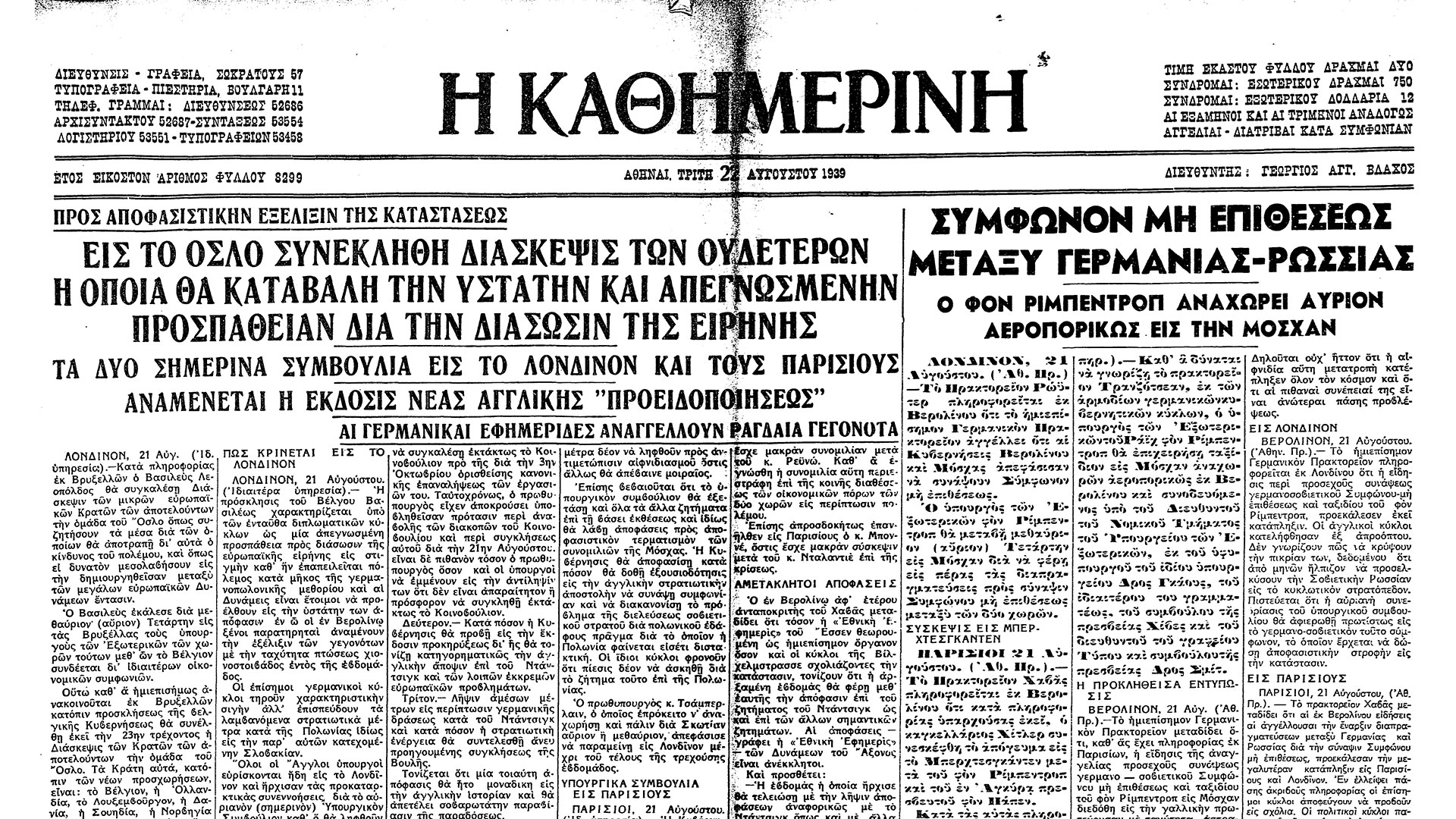 «Το Πρακτορείον Ρώυτερ πληροφορείται ότι το ημιεπίσημον Γερμανικόν Πρακτορείον αγγέλλει ότι αι Κυβερνήσεις Βερολίνου και Μόσχας απεφάσισαν να συνάψουν Σύμφωνον μη επιθέσεως. Ο υπουργός των Εξωτερικών φον Ρίμπεντροπ θα μεταβή μεθαύριον (αύριον) Τετάρτην εις Μόσχαν διά να φέρη εις πέρας τας διαπραγματεύσεις προς σύναψιν Συμφώνου μη επιθέσεως μεταξύ των δύο χωρών», έγραψε η «Καθημερινή» στο πρωτοσέλιδο της 22ας Αυγούστου 1939.