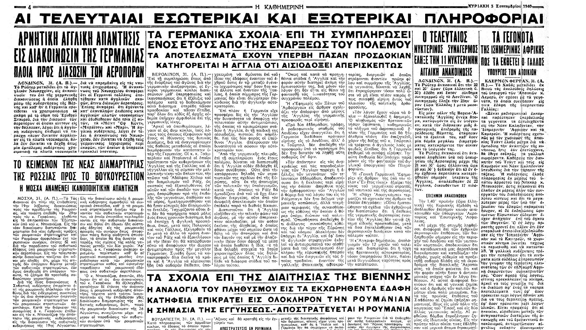 Η «Καθημερινή» παρακολουθούσε τις εξελίξεις στην ευρύτερη «γειτονιά» της Ελλάδας, τα Βαλκάνια. Λίγες ημέρες μετά την αποδοχή της εκχώρησης της Βόρειας Τρανσυλβανίας στην Ουγγαρία, την 1η Σεπτεμβρίου 1940, παρουσίασε σε εκτενές άρθρο τις λεπτομέρειες της συμφωνίας. «Κατά πληροφορίας των αρμοδίων κύκλων, το έδαφος το οποίον προσαρτάται εκ της Ρουμανίας εις την Ουγγαρίαν έχει έκτασιν 45.000 περίπου χιλιομέτρων και πληθυσμόν 2.370.000 ψυχών. Κατά τας στατιστικάς του 1930 ο πληθυσμός αποτελείται από 48% Ούγγρους, 43% Ρουμάνους, 2,5% Γερμανούς και 6,5% διάφορα άλλα στοιχεία», έγραψε χαρακτηριστικά. Παρακάτω ανέφερε ότι «ο κ. Μανωηλέσκο (υπουργός Εξωτερικών Ρουμανίας) ωμίλησε σήμερον την εσπέραν από ραδιοφώνου προς τον ρουμανικόν λαόν, εκφράσας την θλίψιν αυτού και όλων των Ρουμάνων δια την διαιτητικήν απόφασιν της Βιέννης, χαρακτηρίσας όμως την διαιτησίαν αυτήν ως σημαντικήν δια την Ευρώπην, εξ ίσου δε σημαντικήν και την εγγύησιν, την δοθείσαν εις την Ρουμανίαν υπό των Δυνάμεων του Άξονος».
