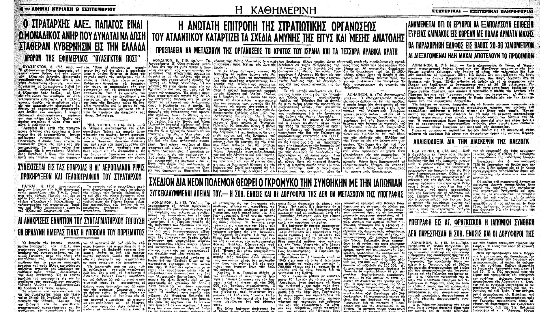 Διαβάζουμε στην εφημερίδα: «Τηλεγραφήματα εξ Αγίου Φραγκίσκου μεταδίδουν ότι η τελετή της υπογραφής της ιαπωνικής συνθήκης εις την τελικήν συνεδρίασιν της διασκέψεως ήρχισεν εις ήρεμον ατμόσφαιραν, περί ώραν 17.12 Γκρήνουιτς. Την προεδρικήν έδραν κατείχεν ο κ. Άτσεσον, ενώ τα εδώλια της ρωσικής αντιπροσωπείας και εκείνα των δύο αντιπροσωπειών της Τσεχοσλοβακίας και της Πολωνίας παρέμεναν κενά».
